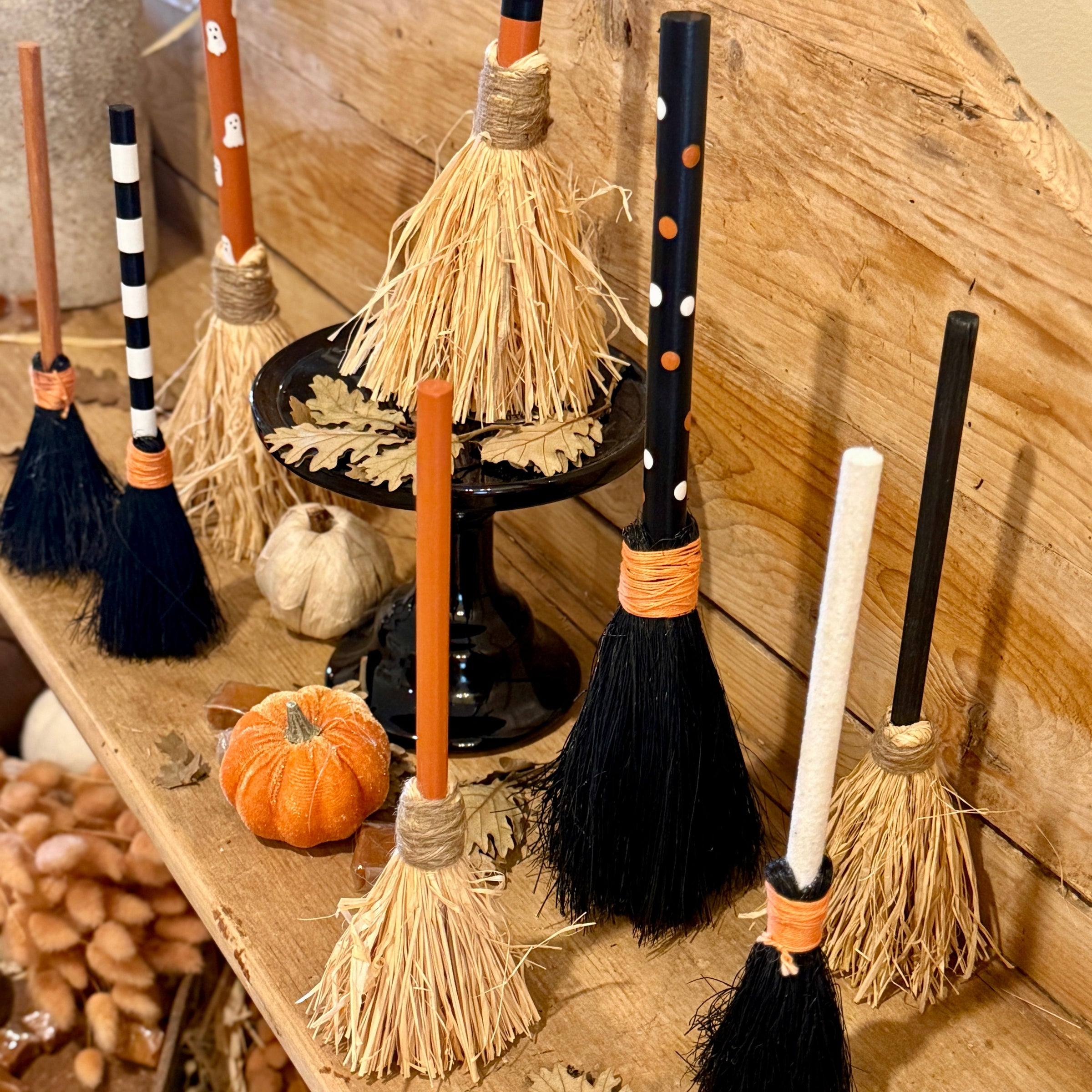 Orange Washed Wood Broomstick with Orange String Wrapped Around Black Bristles