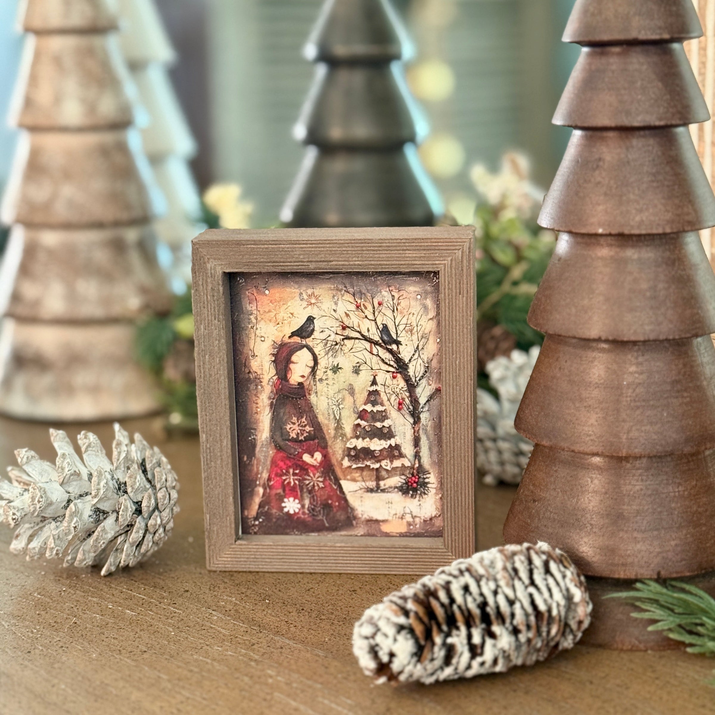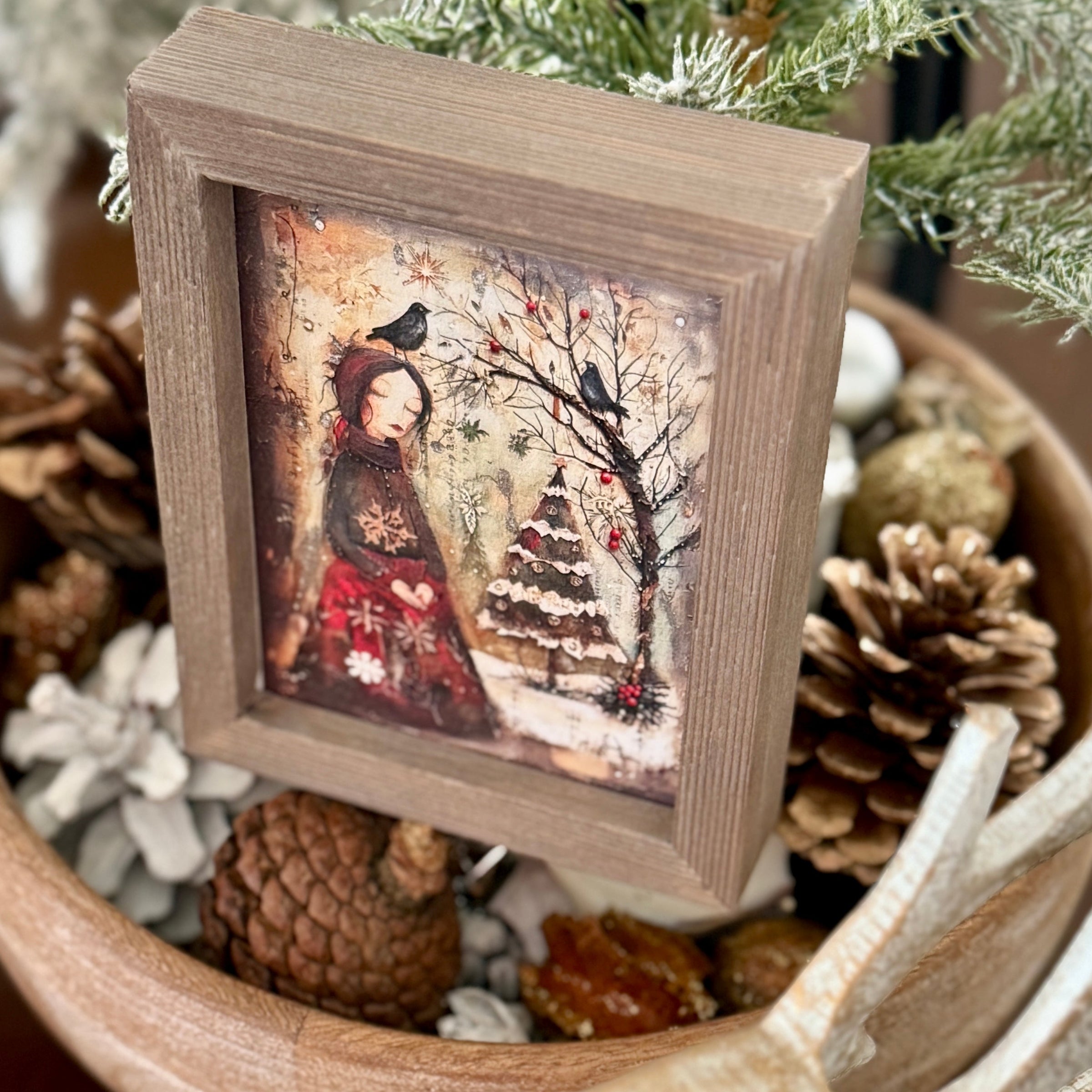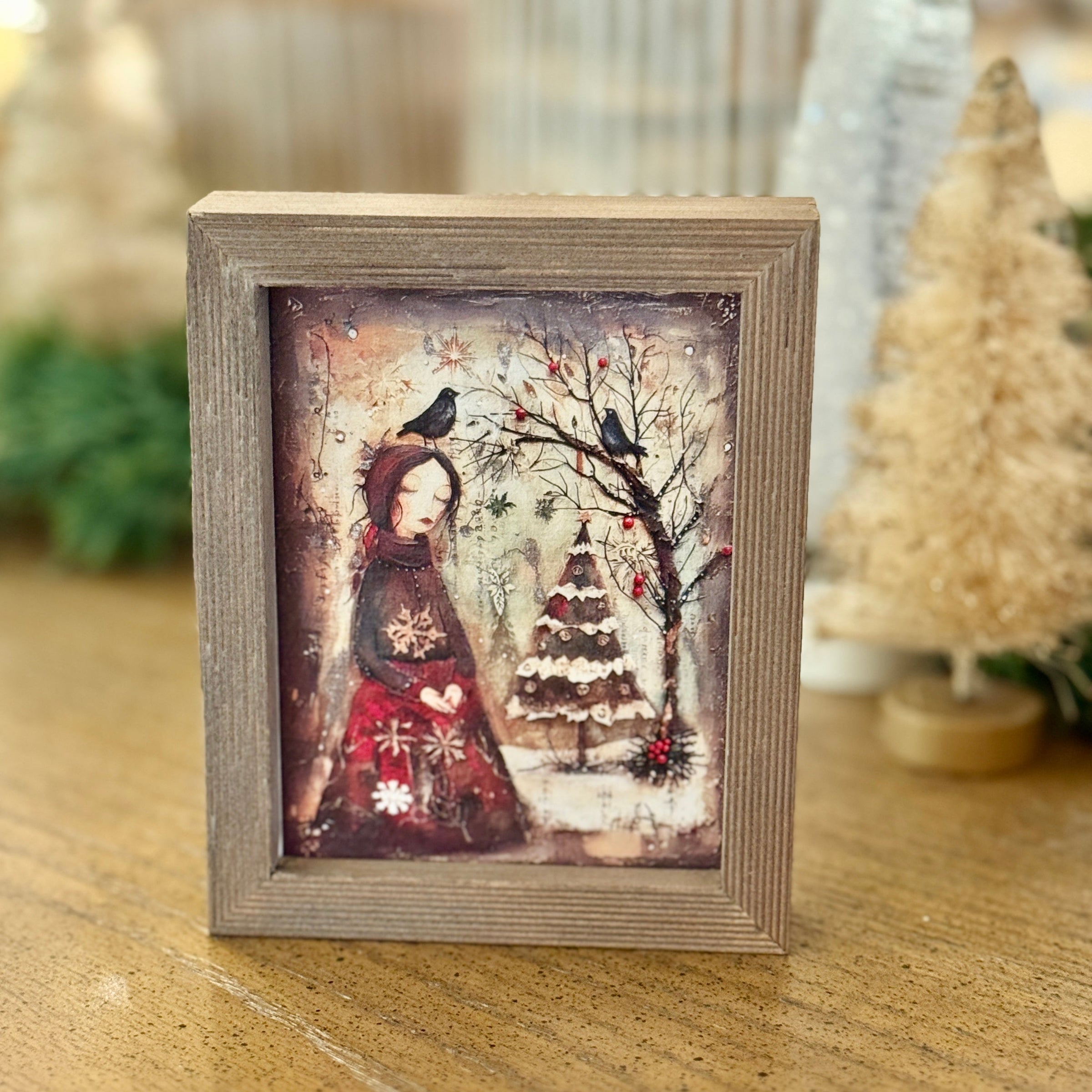 Barnwood Mini Frame with Woman, Bird, Forest Artwork Print Inside
