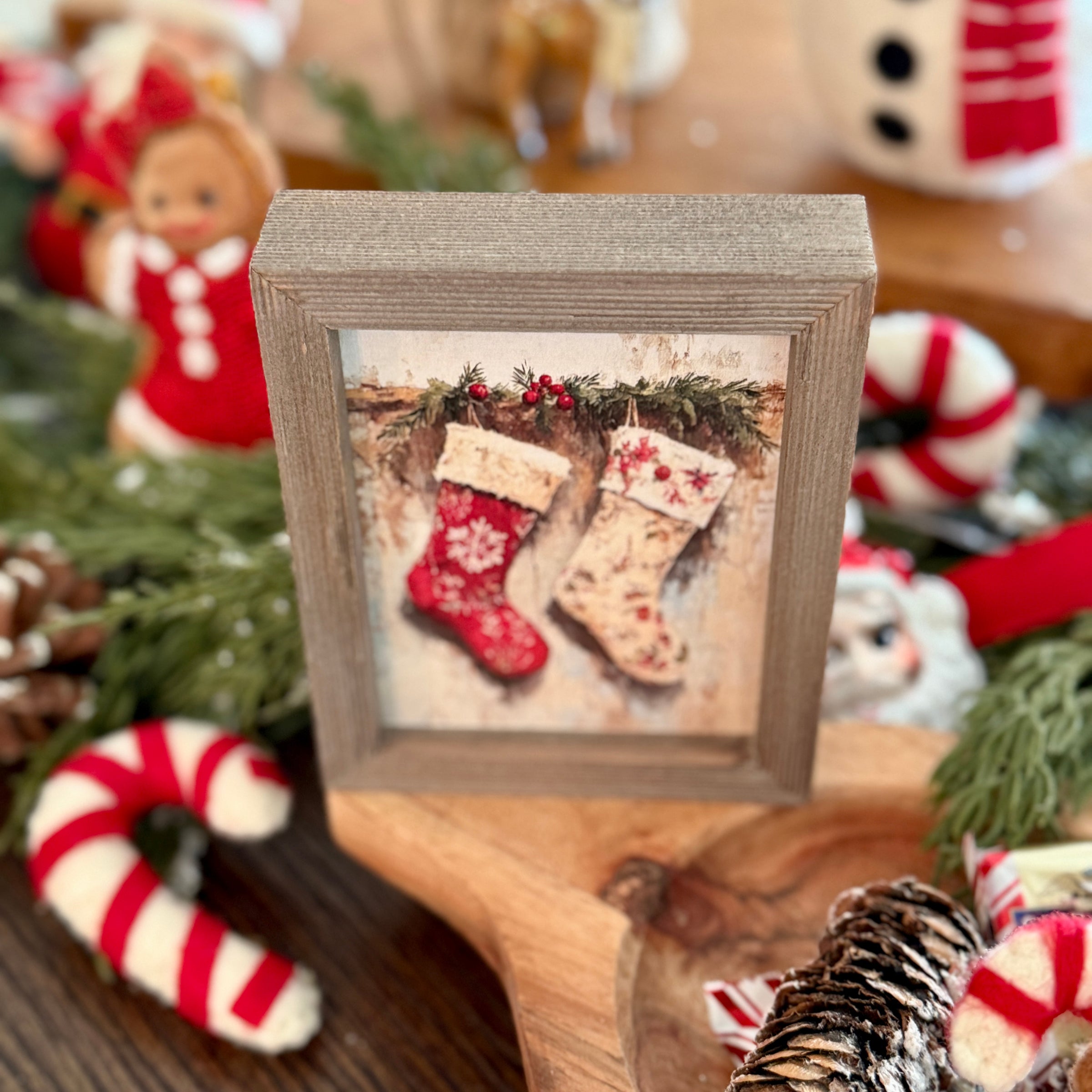 Barnwood Mini Frame with Two Stockings Hanging from Mantel Artwork Print Inside