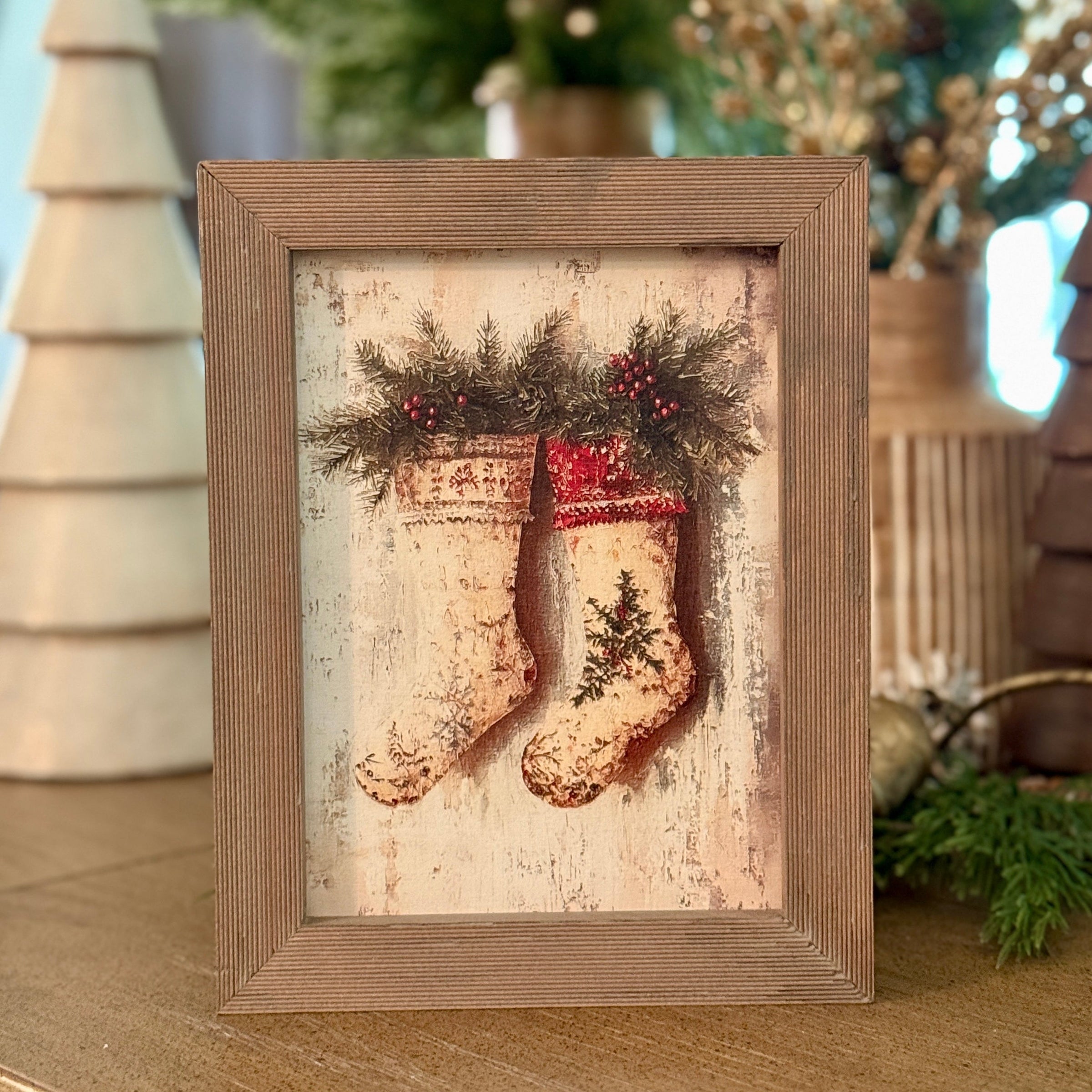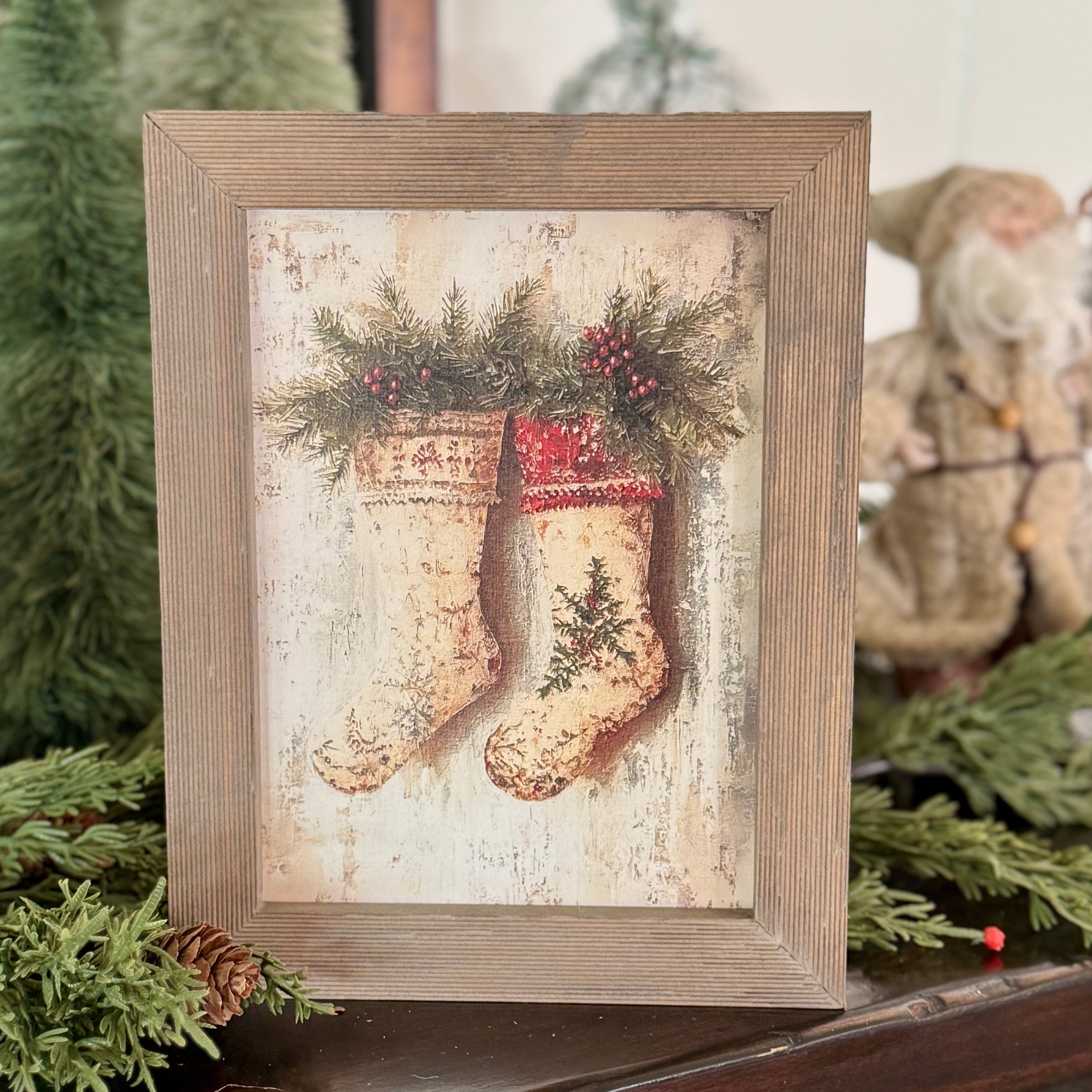 Barnwood Frame with Two Stockings and Greenery Artwork Print Inside
