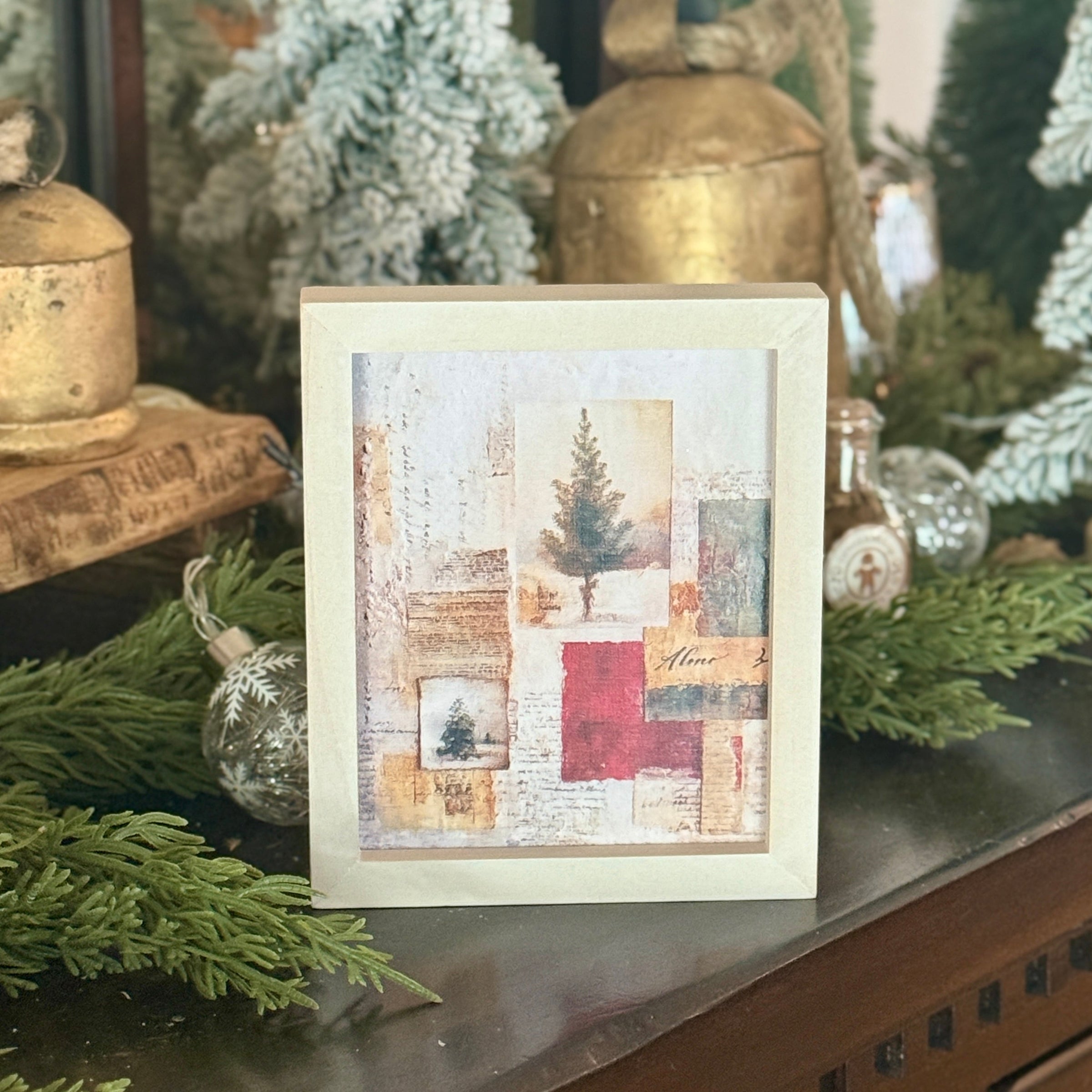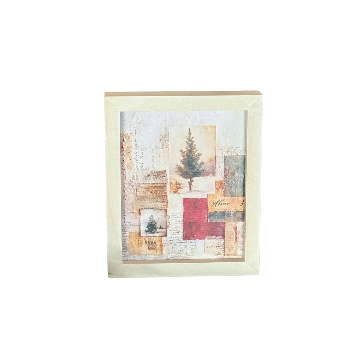 White Washed Wood Mini Frame with Evergreen Tree Collage Artwork Print Inside