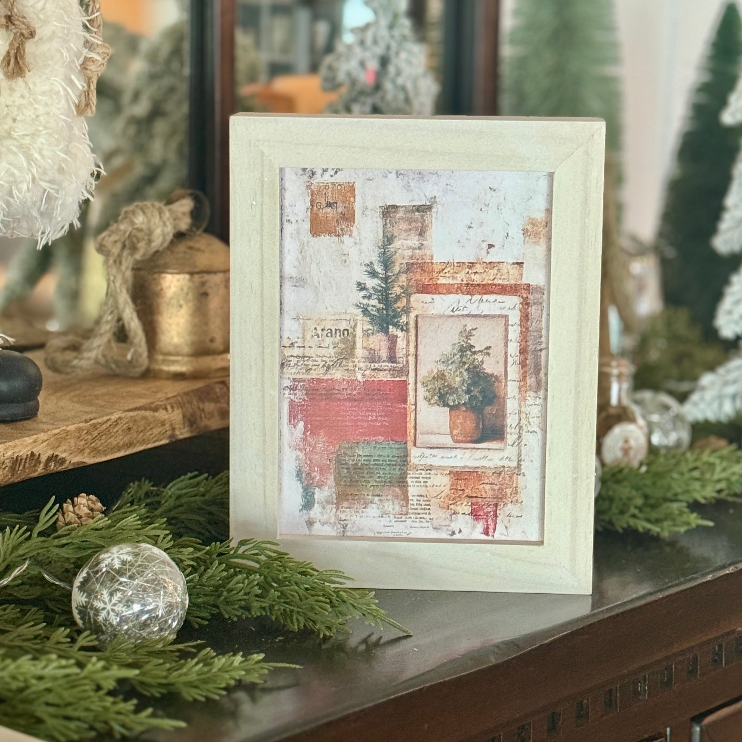 White Washed Wood Frame with Christmas Tree Collage Artwork Print Inside