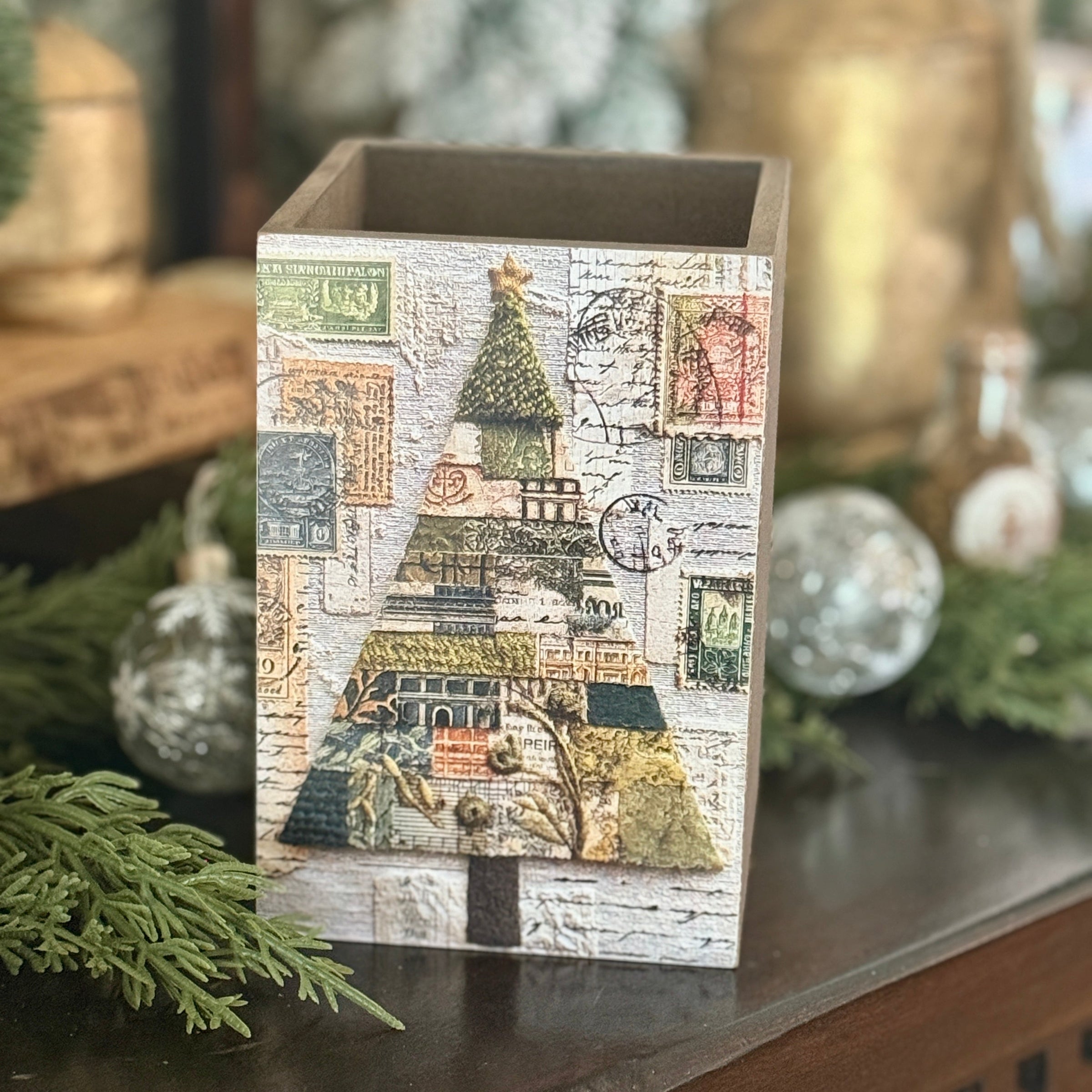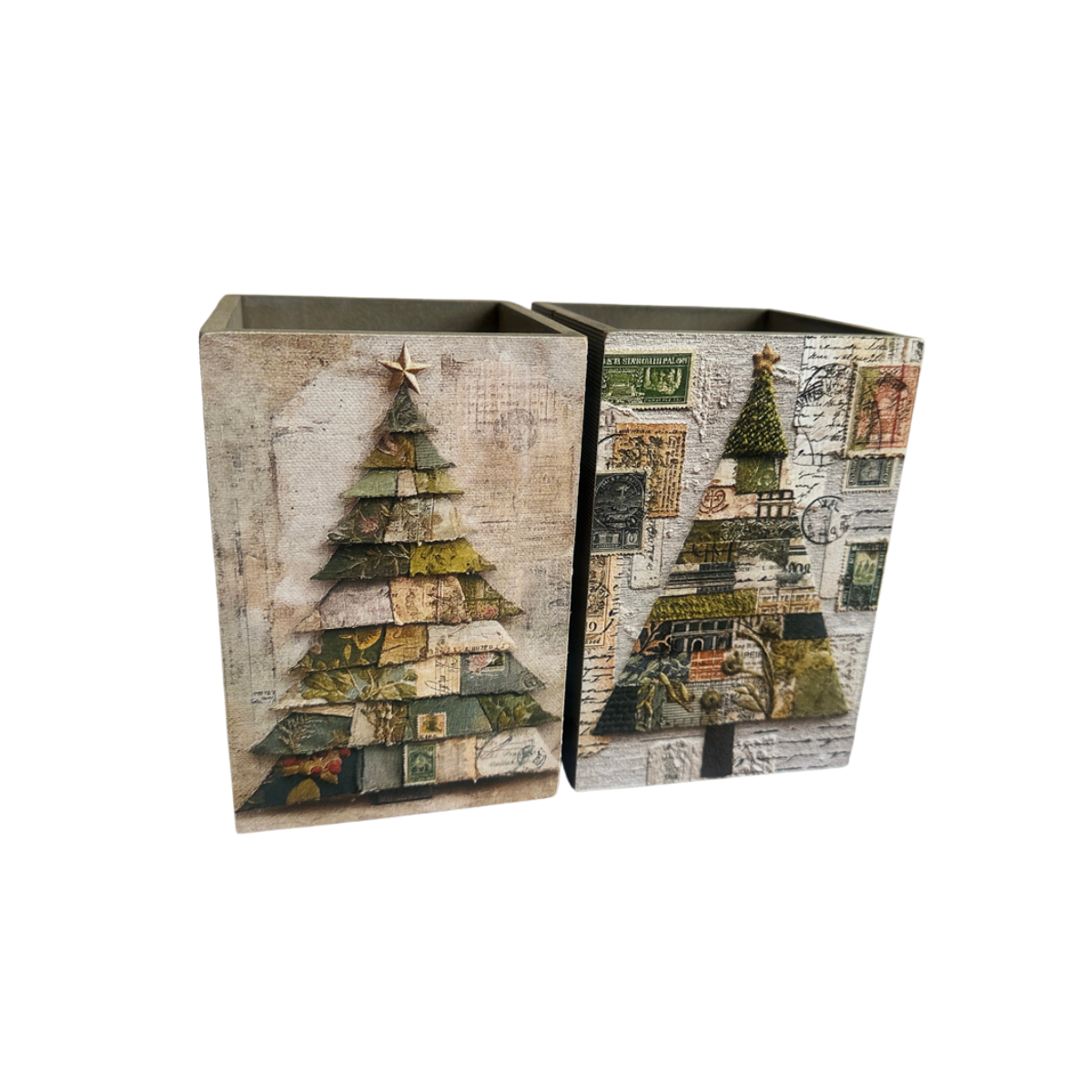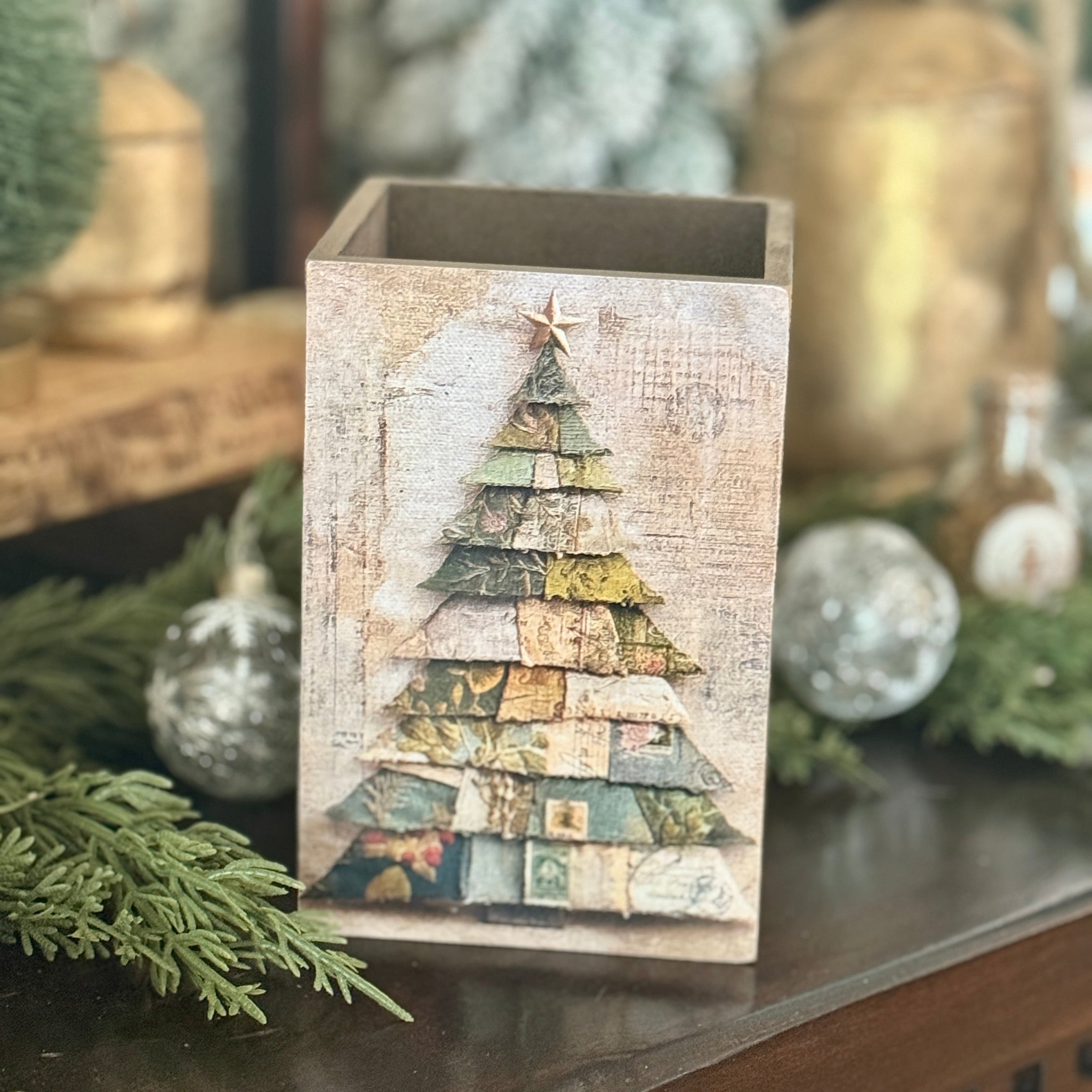 Wood Container with Christmas Tree Print Artwork Attached to the on one end and Christmas Tree Print Artwork Attached to the front on the other end, sides of container are Barnwood