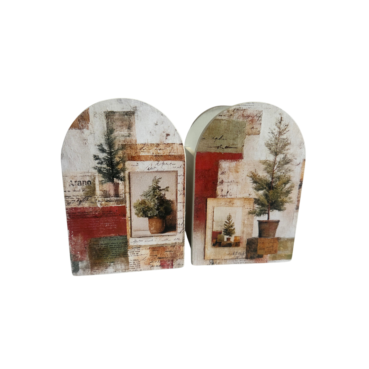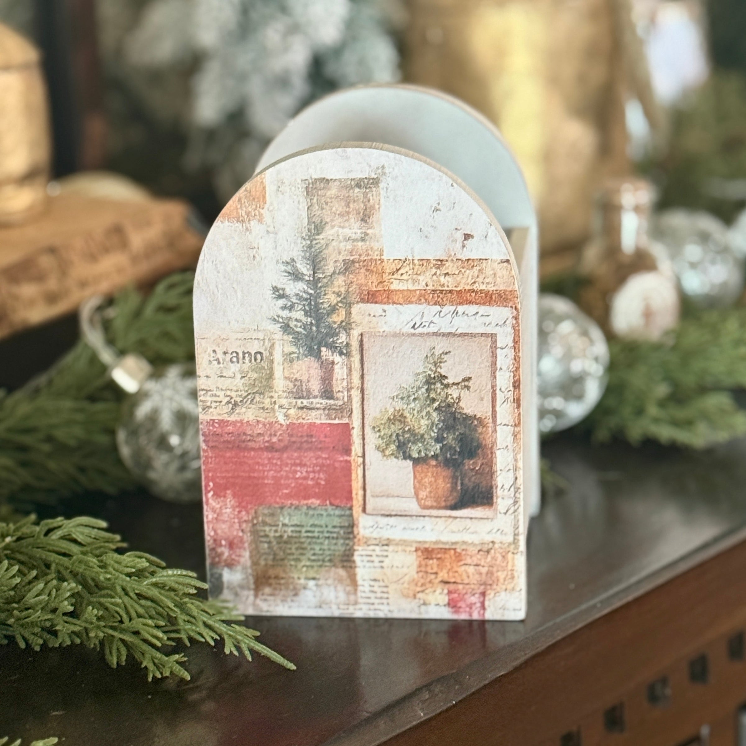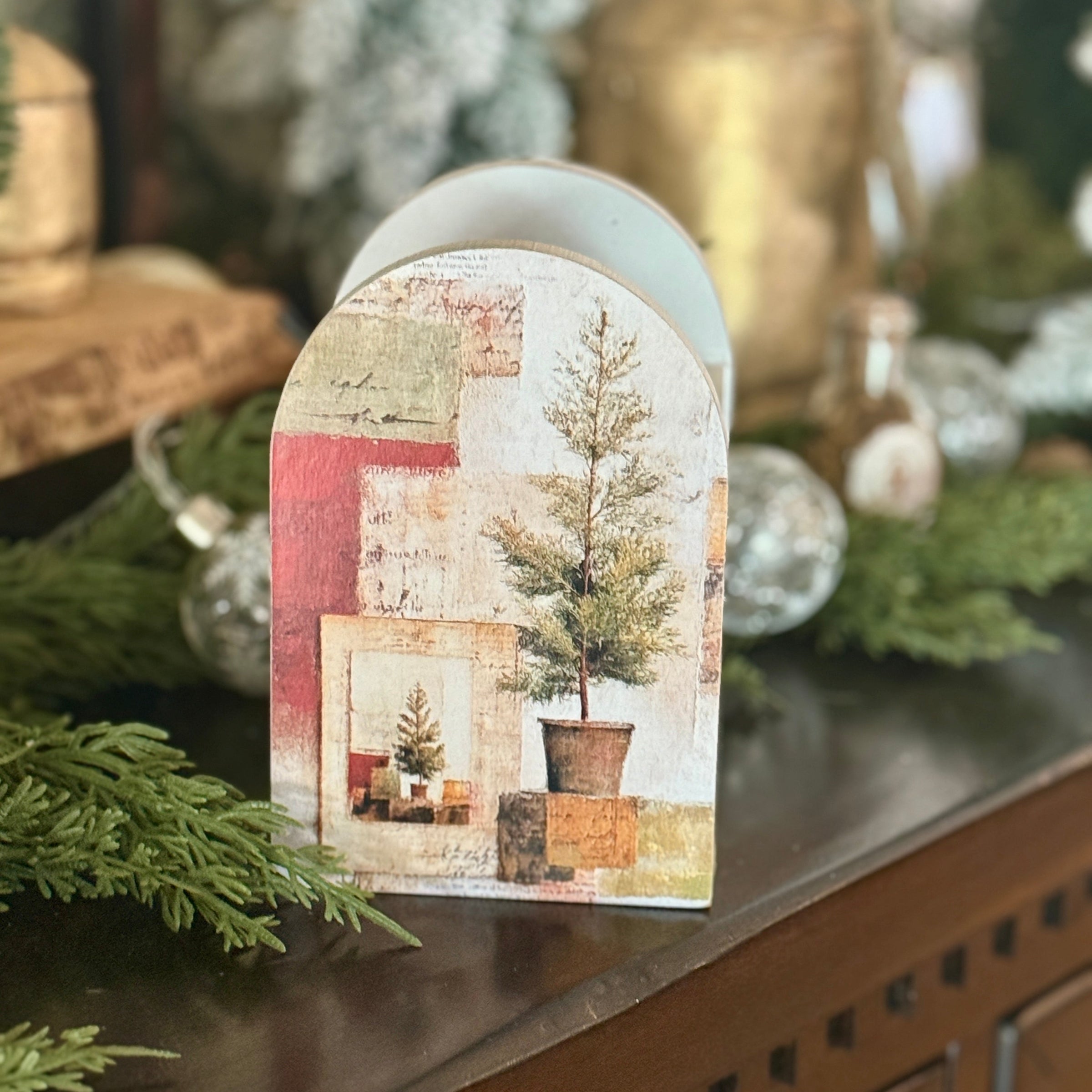 White Washed Wood Arch Container with Christmas Tree Collage Print Artwork Attached to the front on one end and Christmas Tree Collage Print Artwork Attached to the front on the other end, sides of container are White Washed Wood