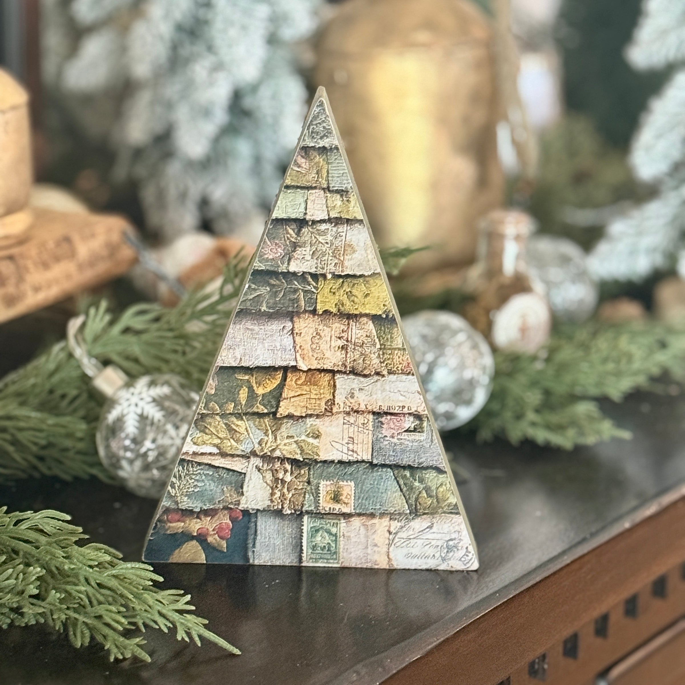 Green Washed Wood Tree Cutout with Tree Collage Artwork Print Attached to the front