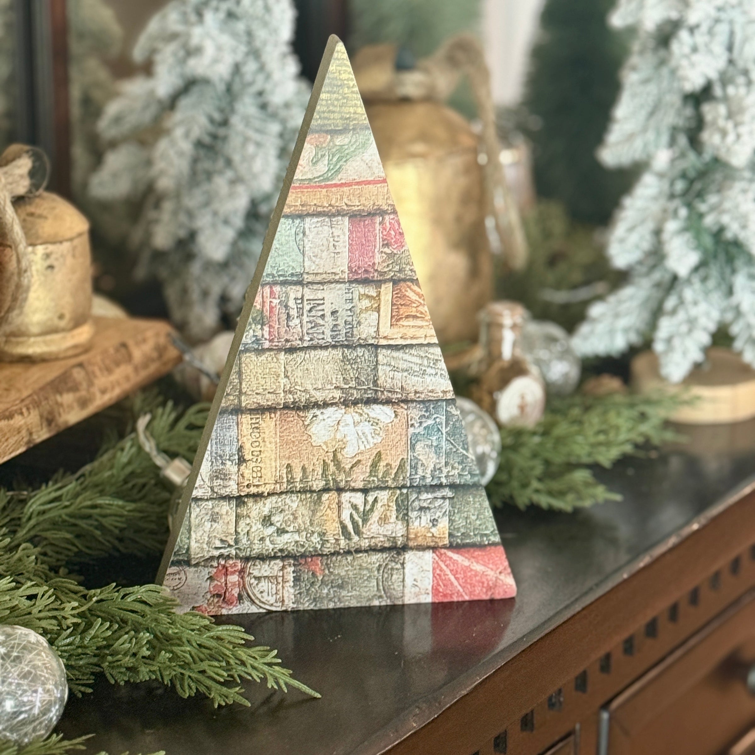 Green Washed Wood Tree Cutout with Tree Collage Artwork Print Attached to the front
