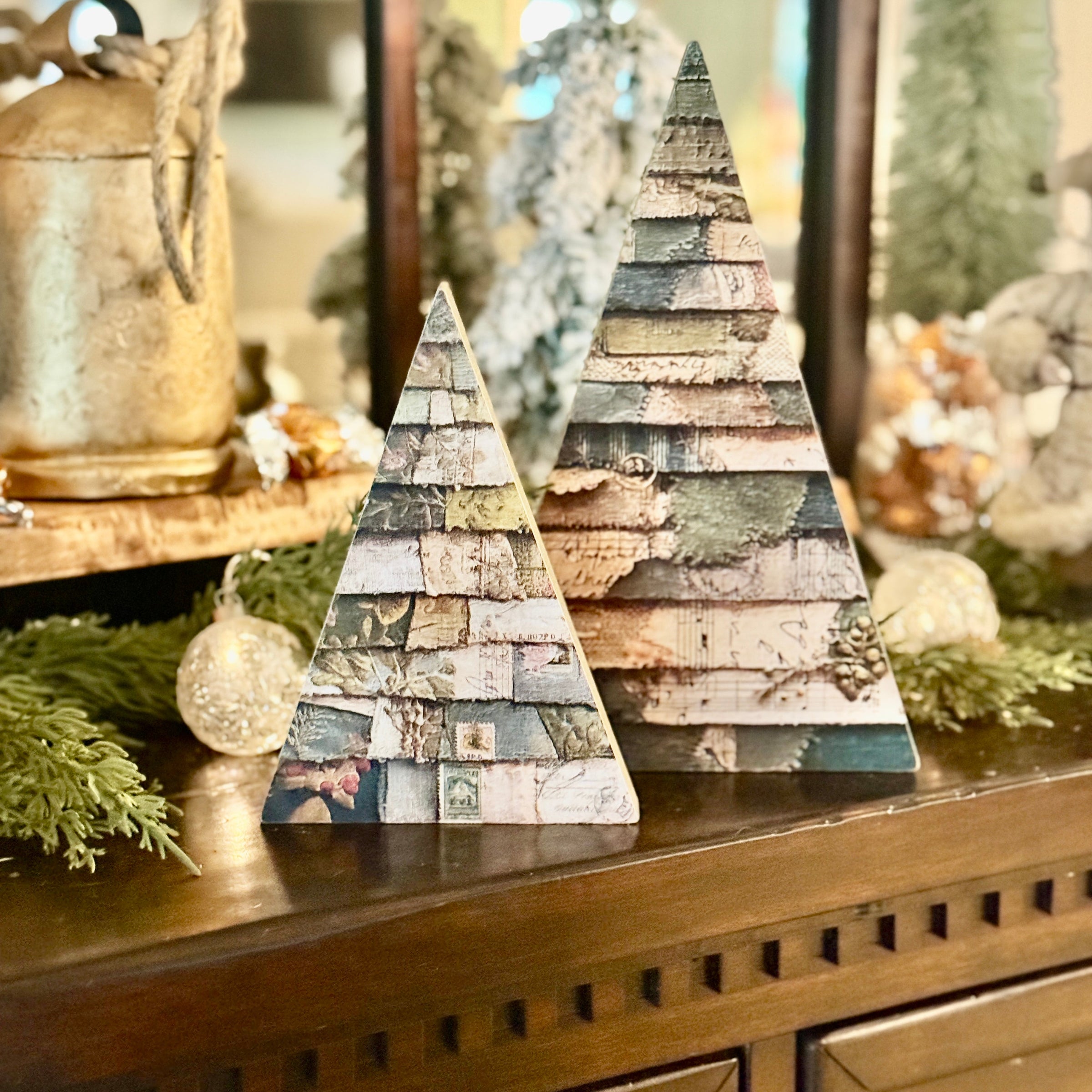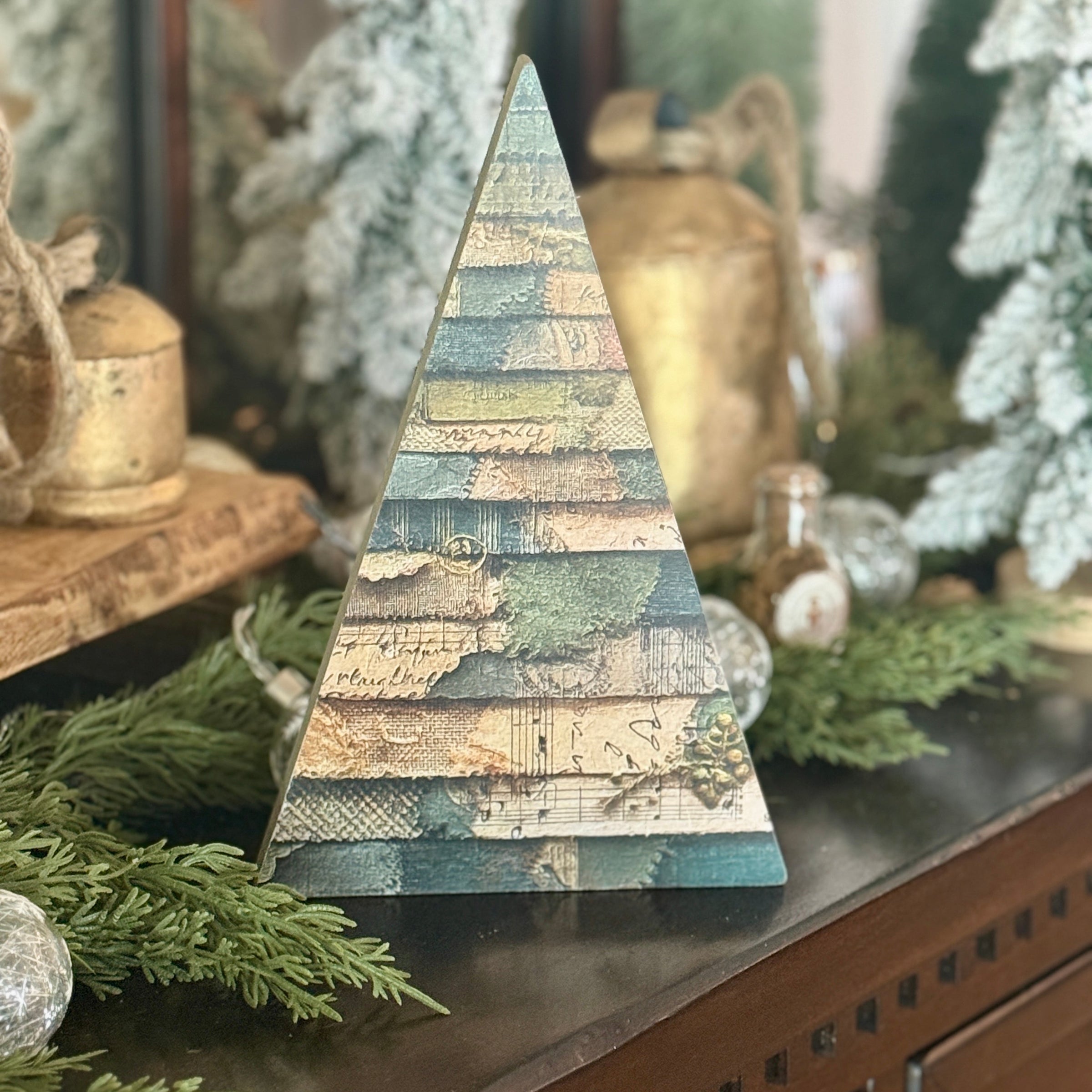 Green Washed Wood Tree Cutout with Tree Collage Artwork Print Attached to the front