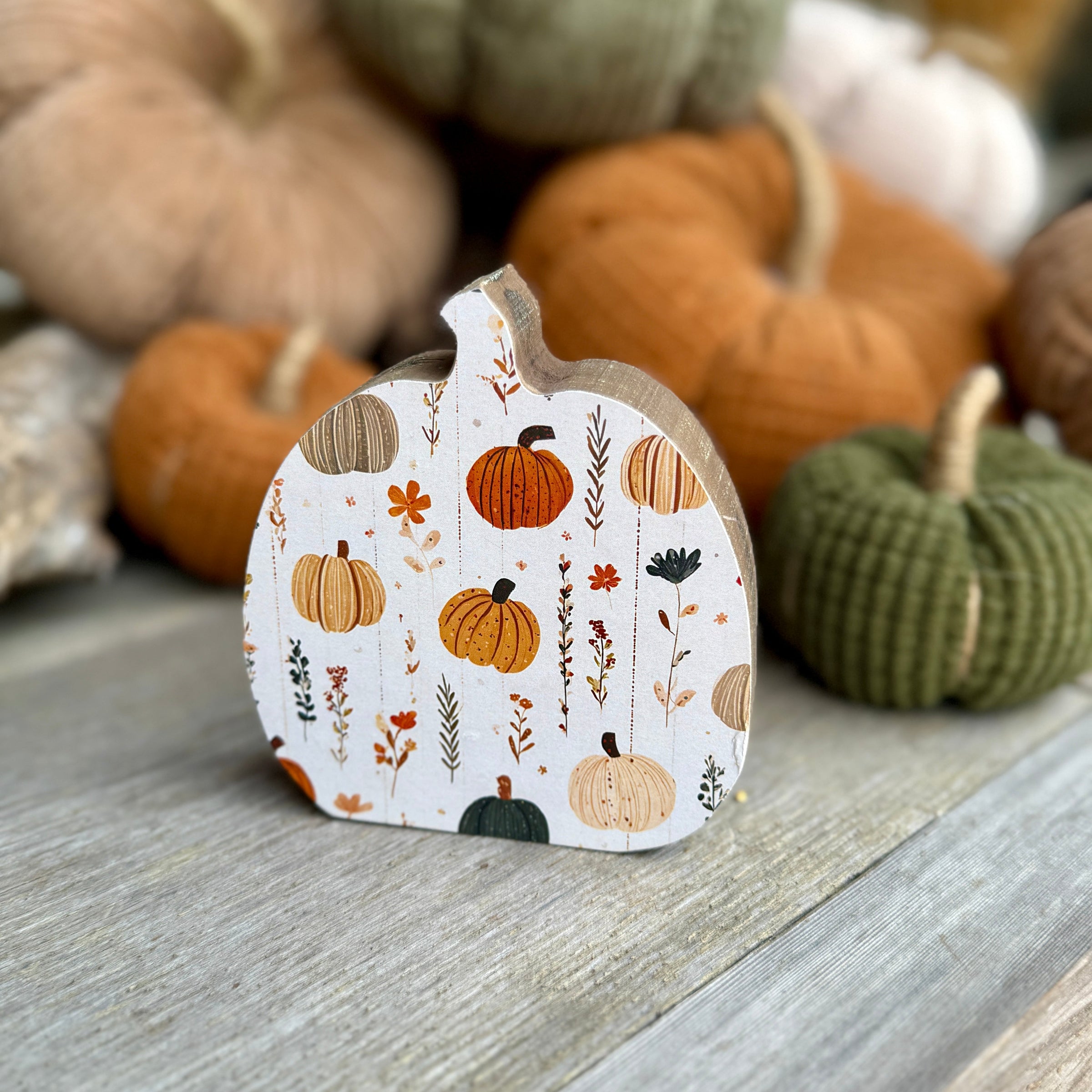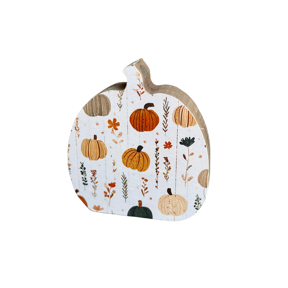 Wood Washed Pumpkin Cutout with Pumpkins and Greenery/Floral Artwork Attached to Front
