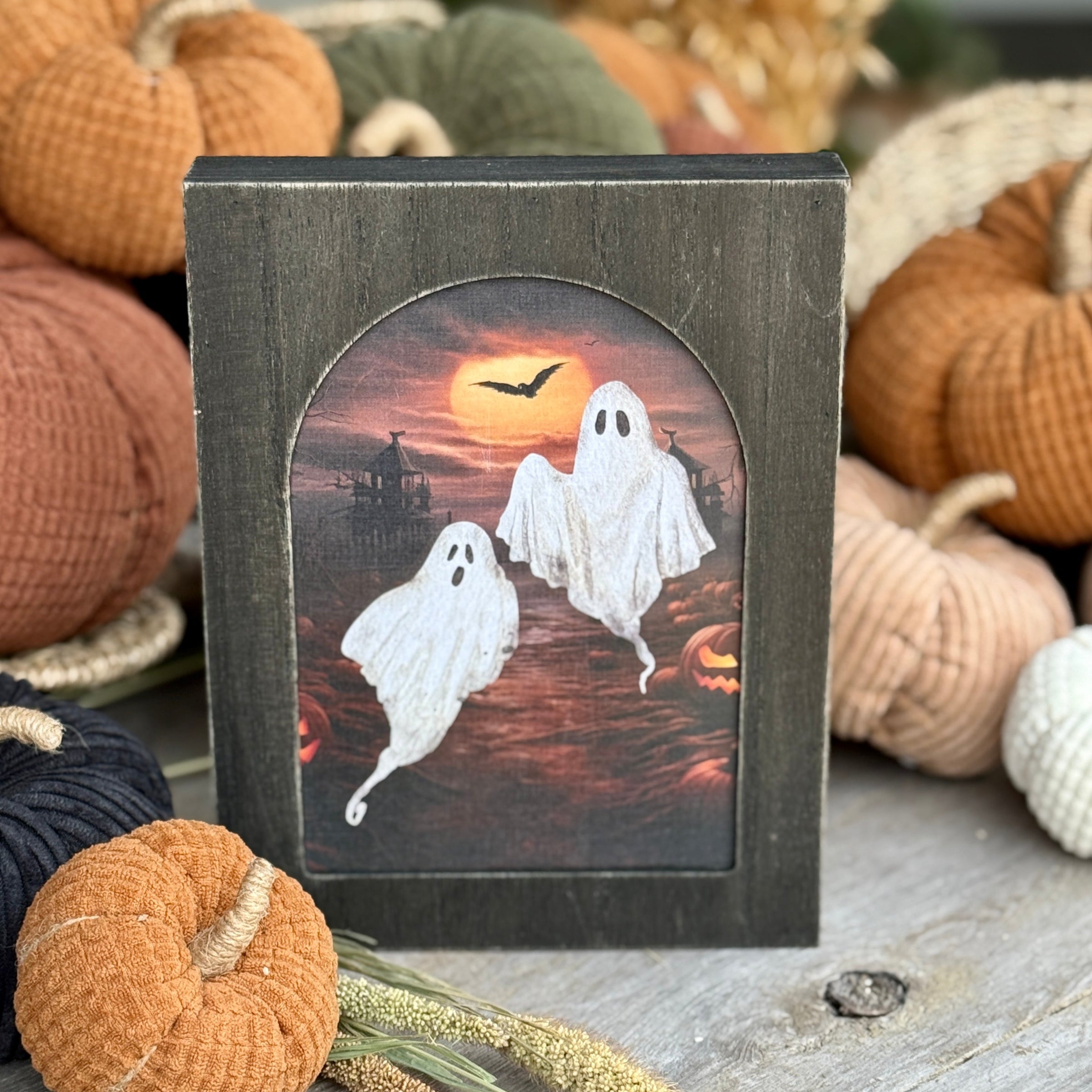 Black Washed Wood Arched Wood Frame with Two Ghosts Artwork Print Inside