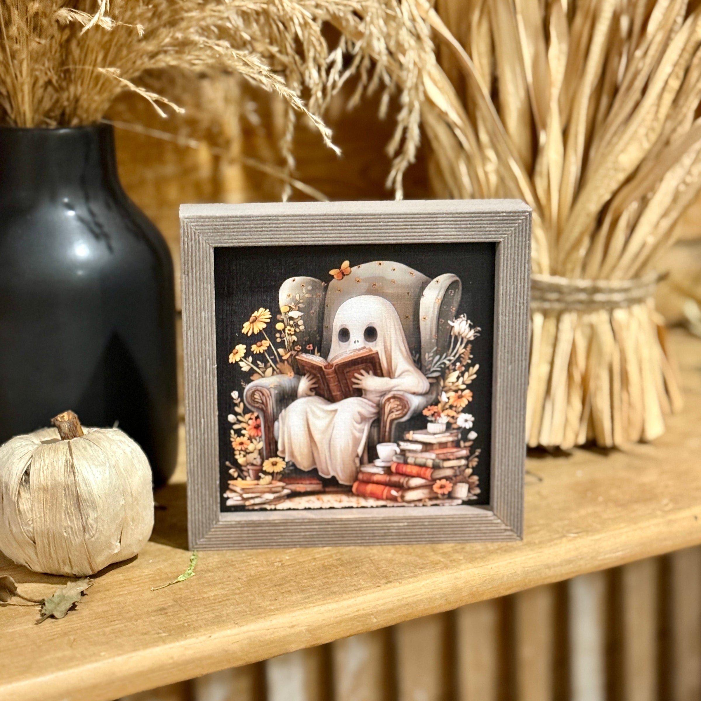Black Washed Wood Mini Frame with Ghost in Chair Reading Artwork Print Inside
