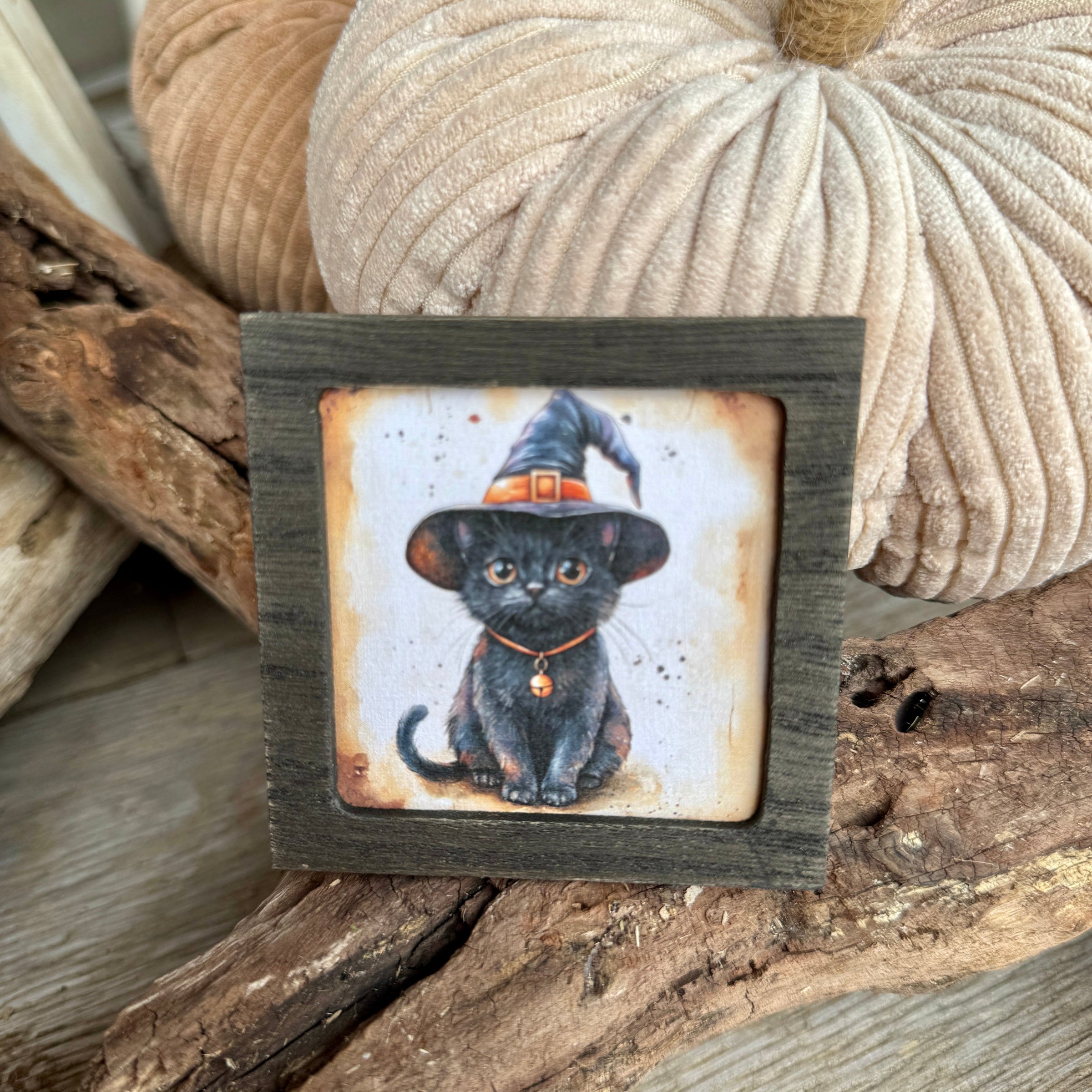 Black Washed Wood Framed Magnet with Black Cat with Witch Hat Artwork Print Inside