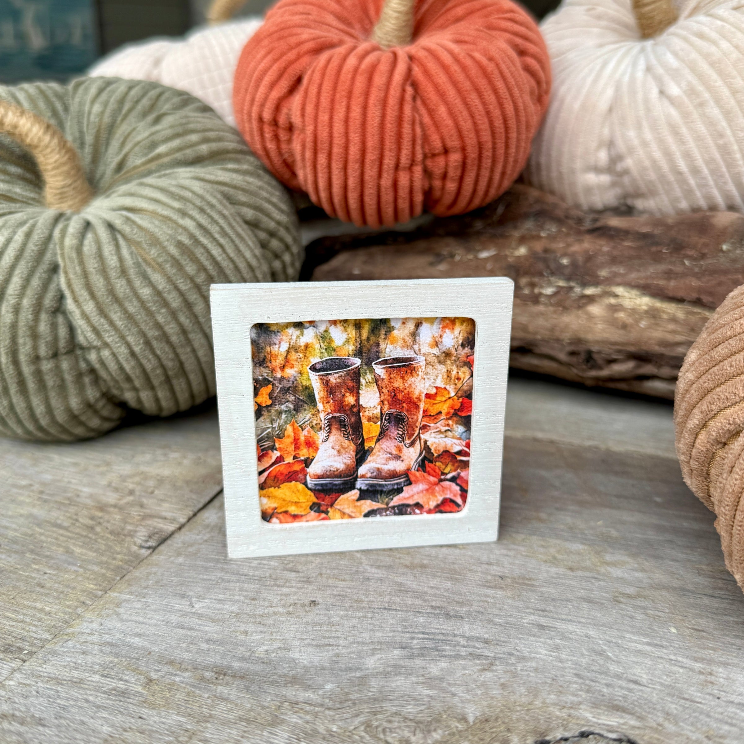 White Washed Wood Framed Magnet with Fall Boots and Leaves Artwork Print Inside