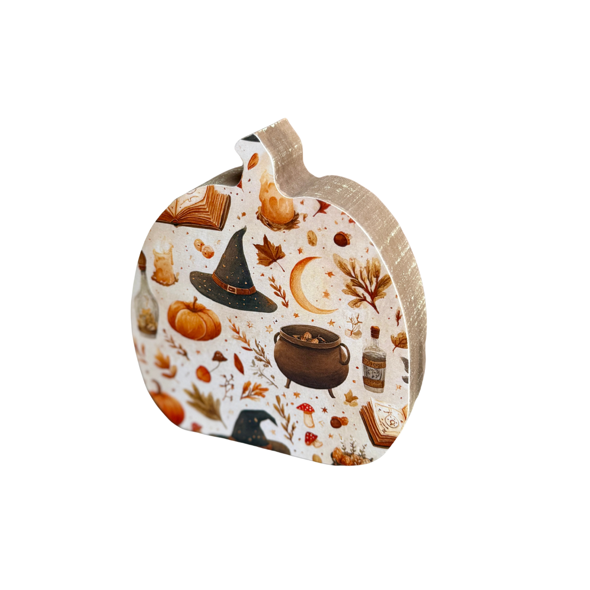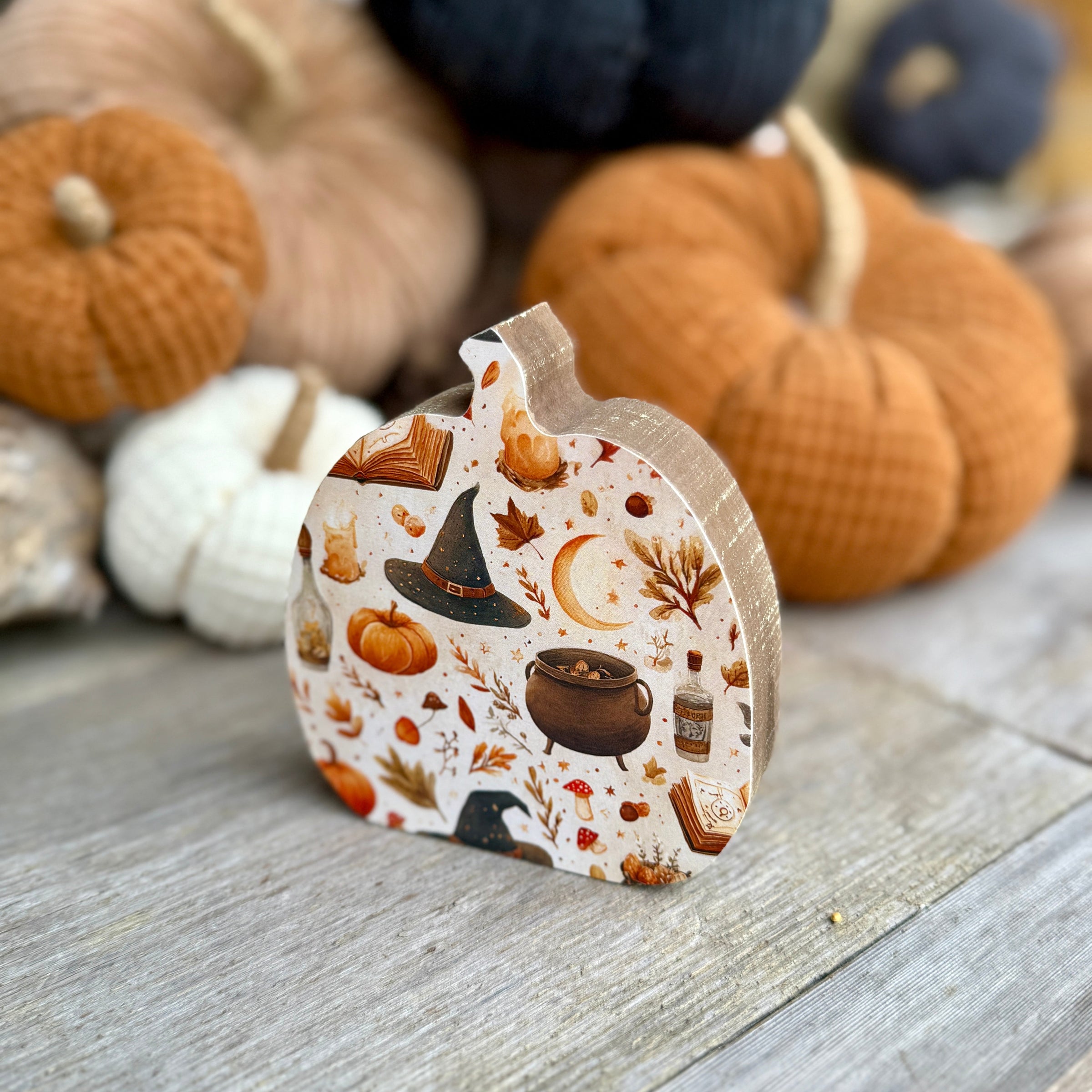 Wood Washed Pumpkin Cutout with Witch Hat, Potion Bottle, Cauldron, Spell Book, Pumpkins, Moon, and Greenery Artwork Print Attached to Front