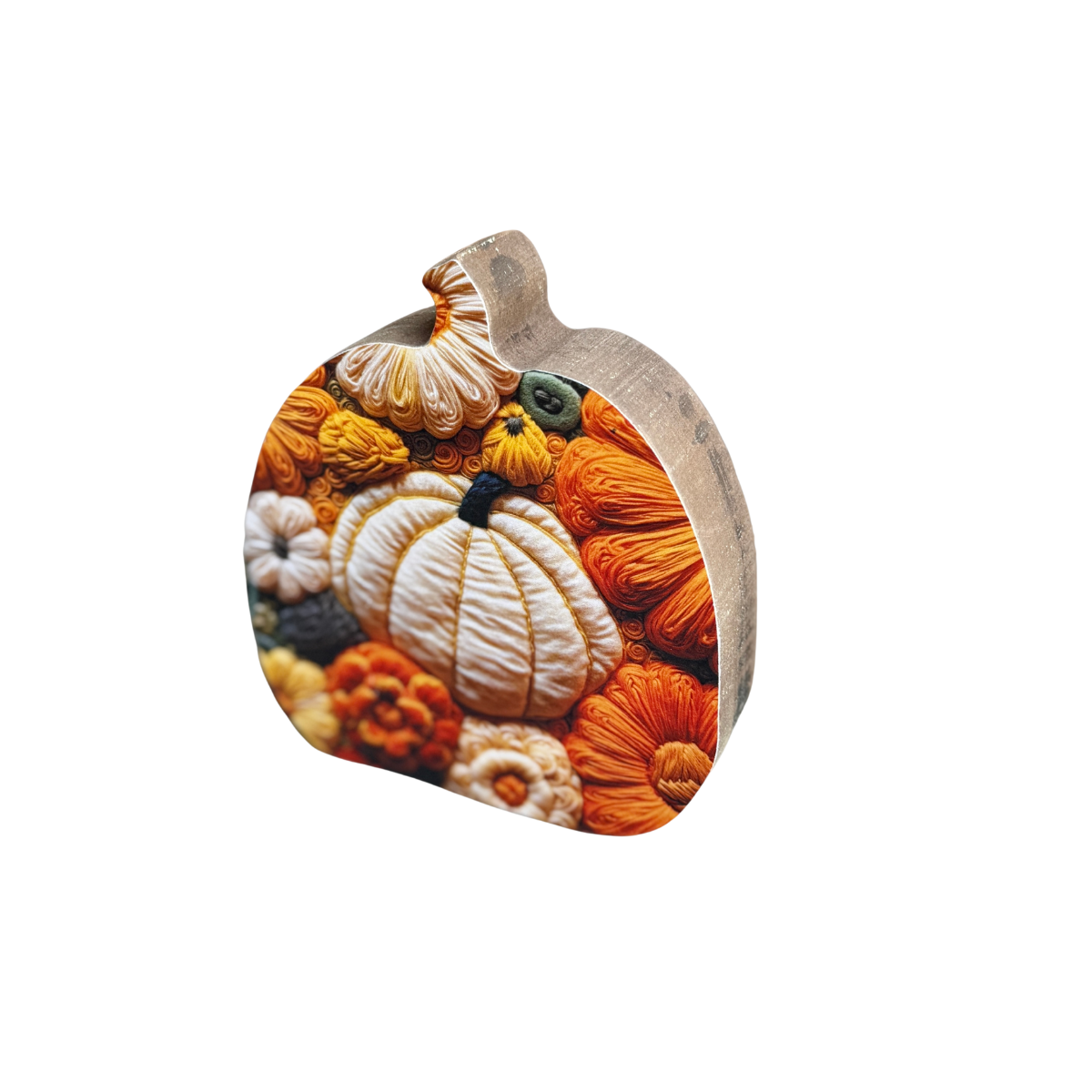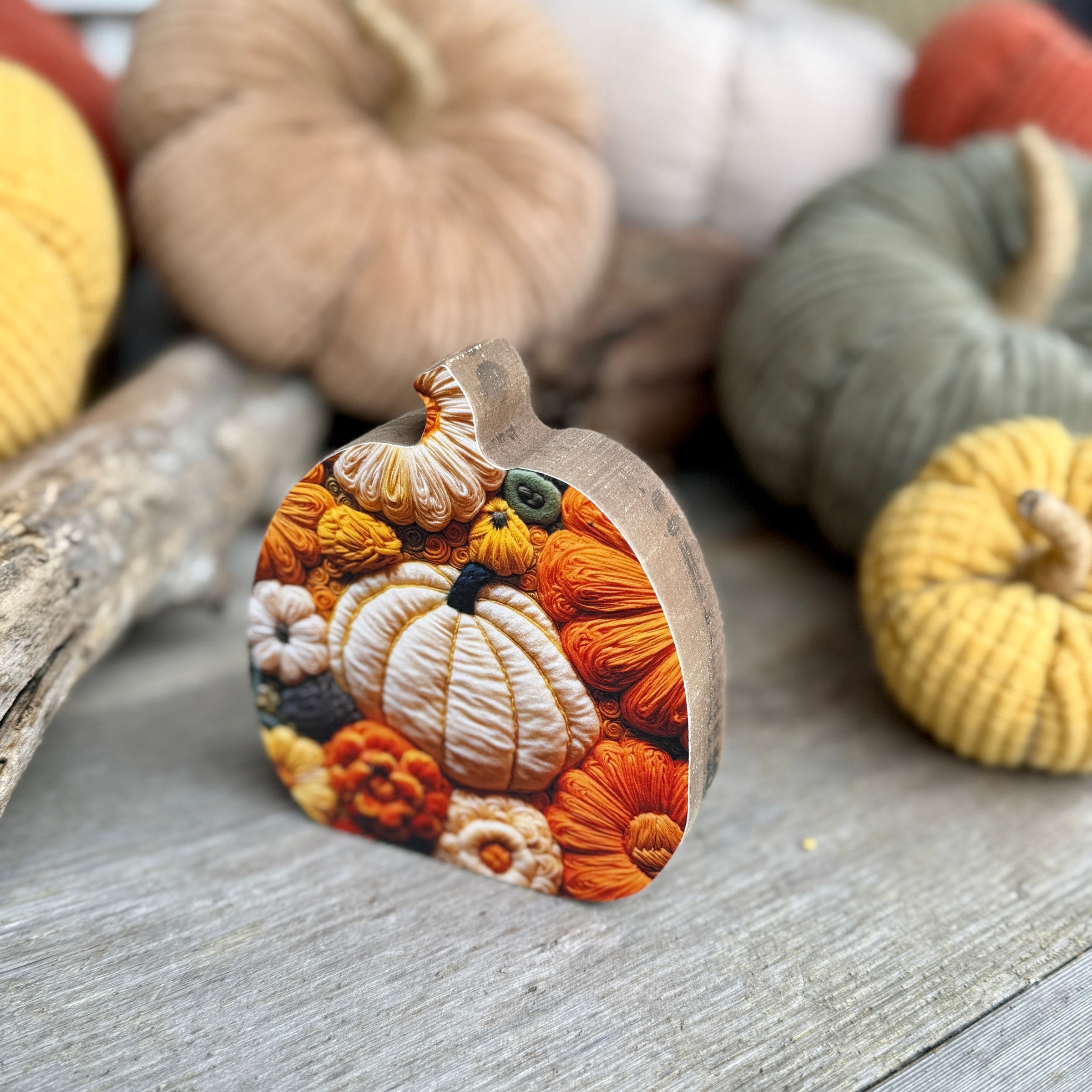 Wood Washed Pumpkin Cutout with Embroidered Pumpkins Print Attached to Front