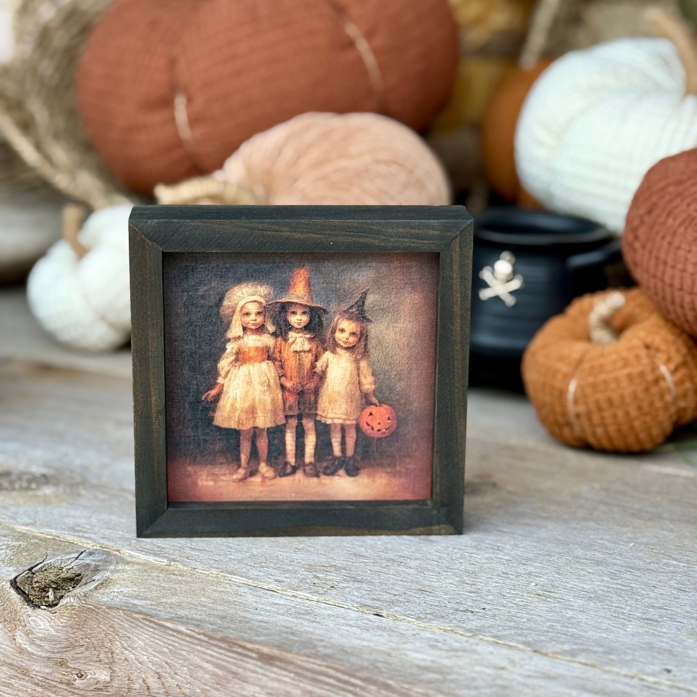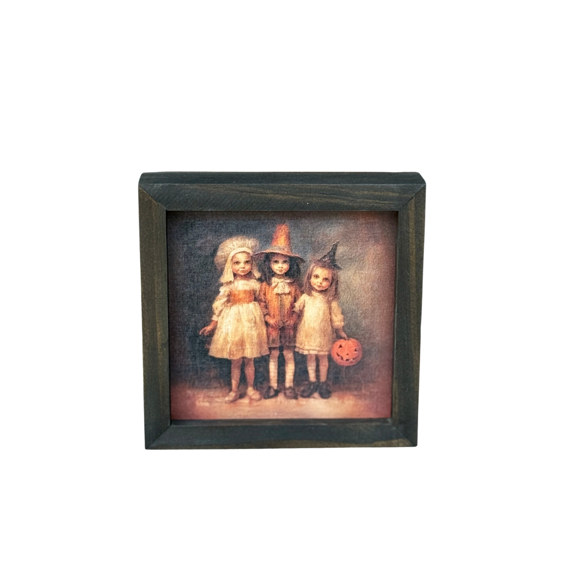 Black Washed Wood Mini Frame with 3 Spooky Children Artwork Print Inside