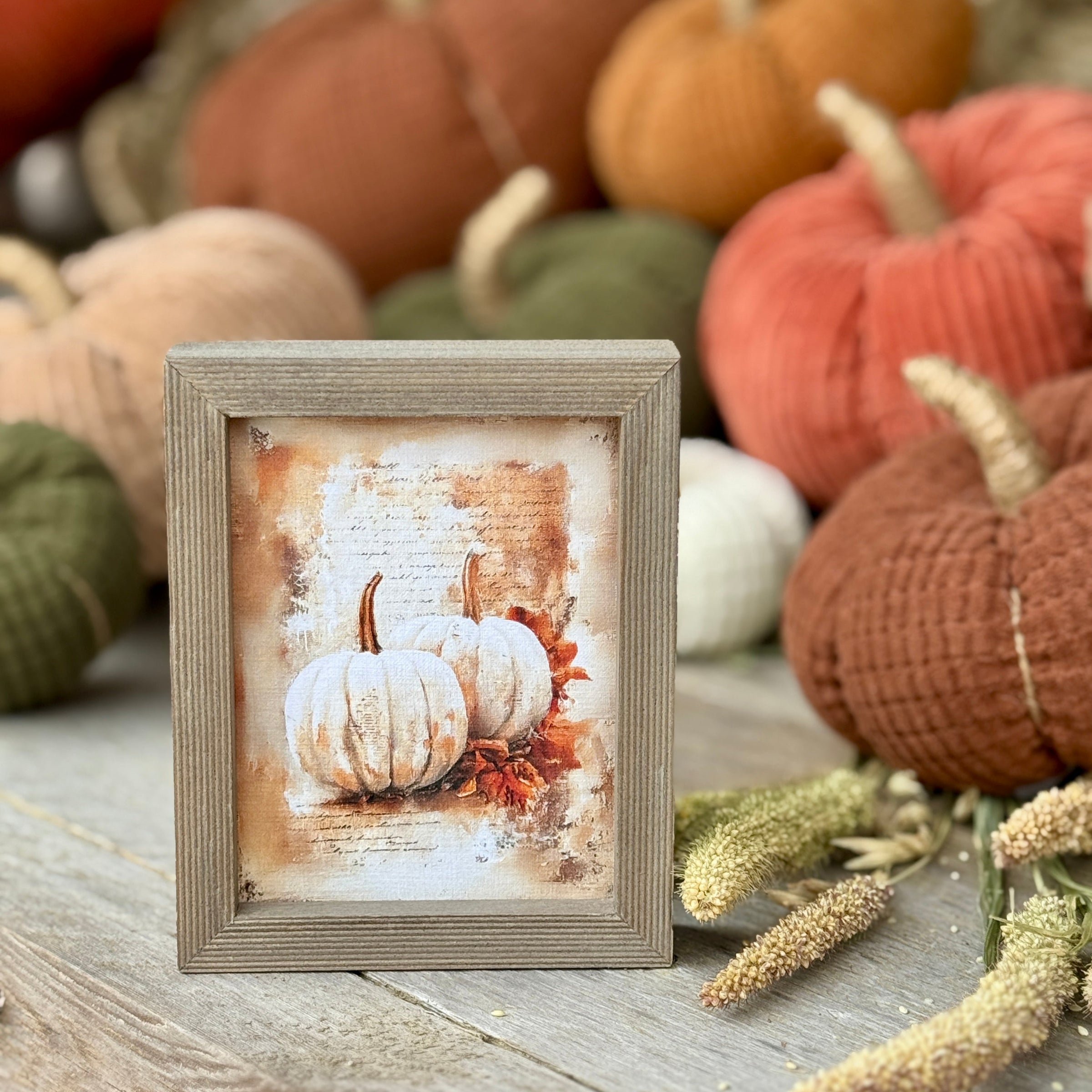 Barnwood Mini Frame with White Pumpkins and Leaves Artwork Print Inside