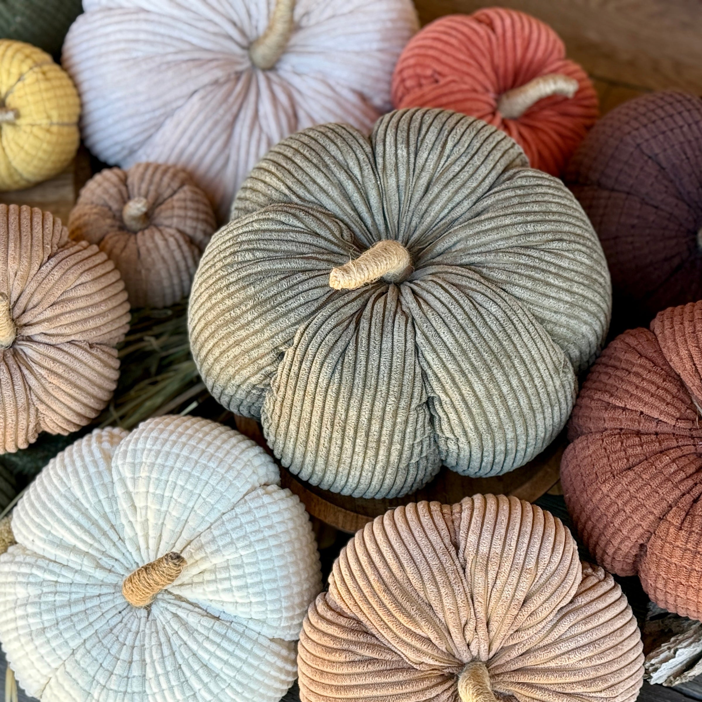 Evergreen Wide Corduroy Pumpkin with Jute Wrapped Stem