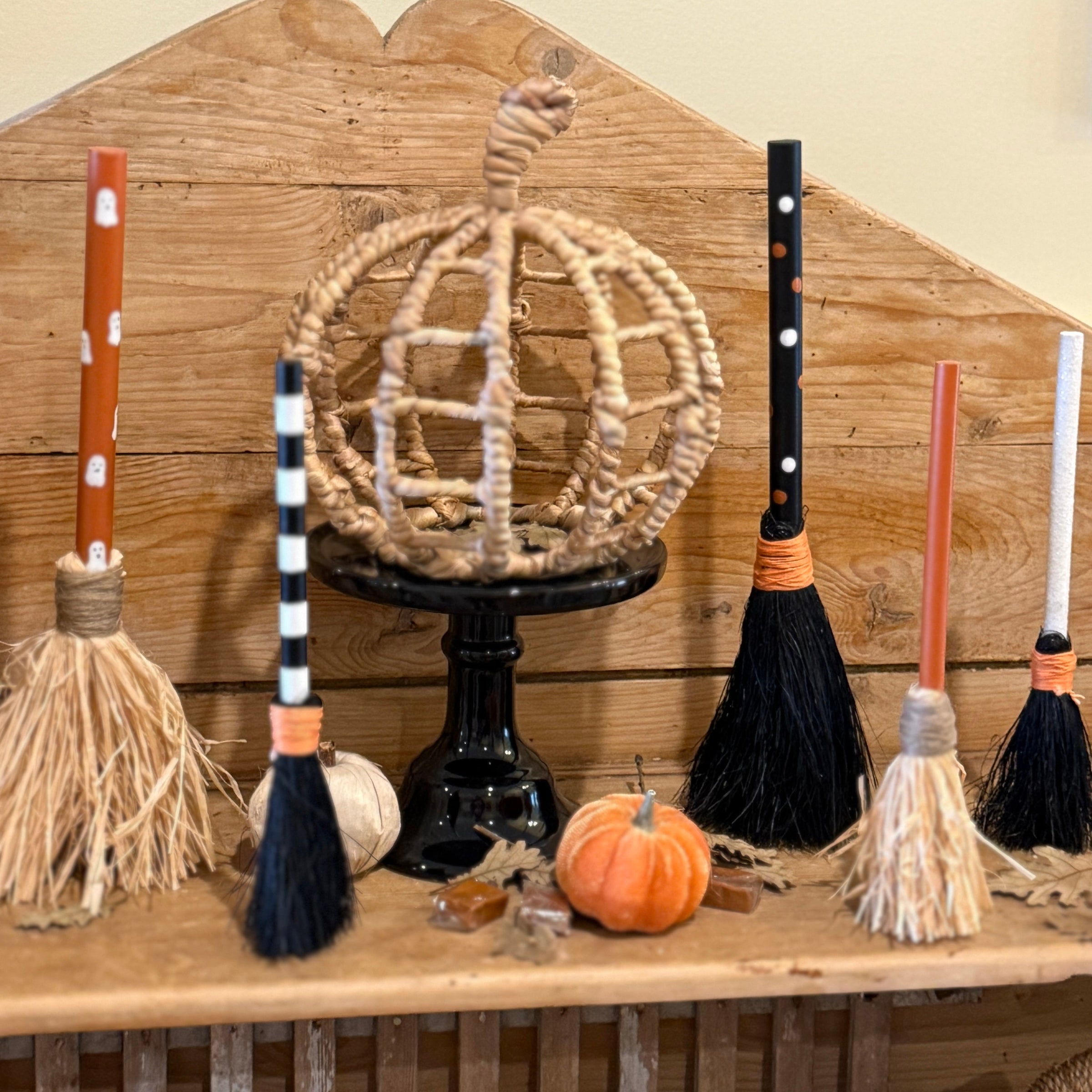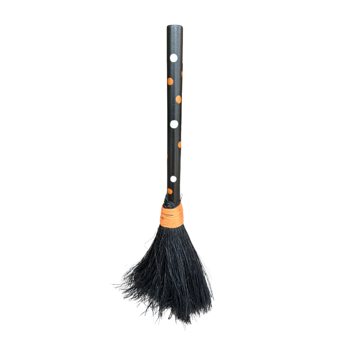Black with Orange and White Polka Dots Painted Wooden Broomstick with Orange String Wrapped Around Black Bristles