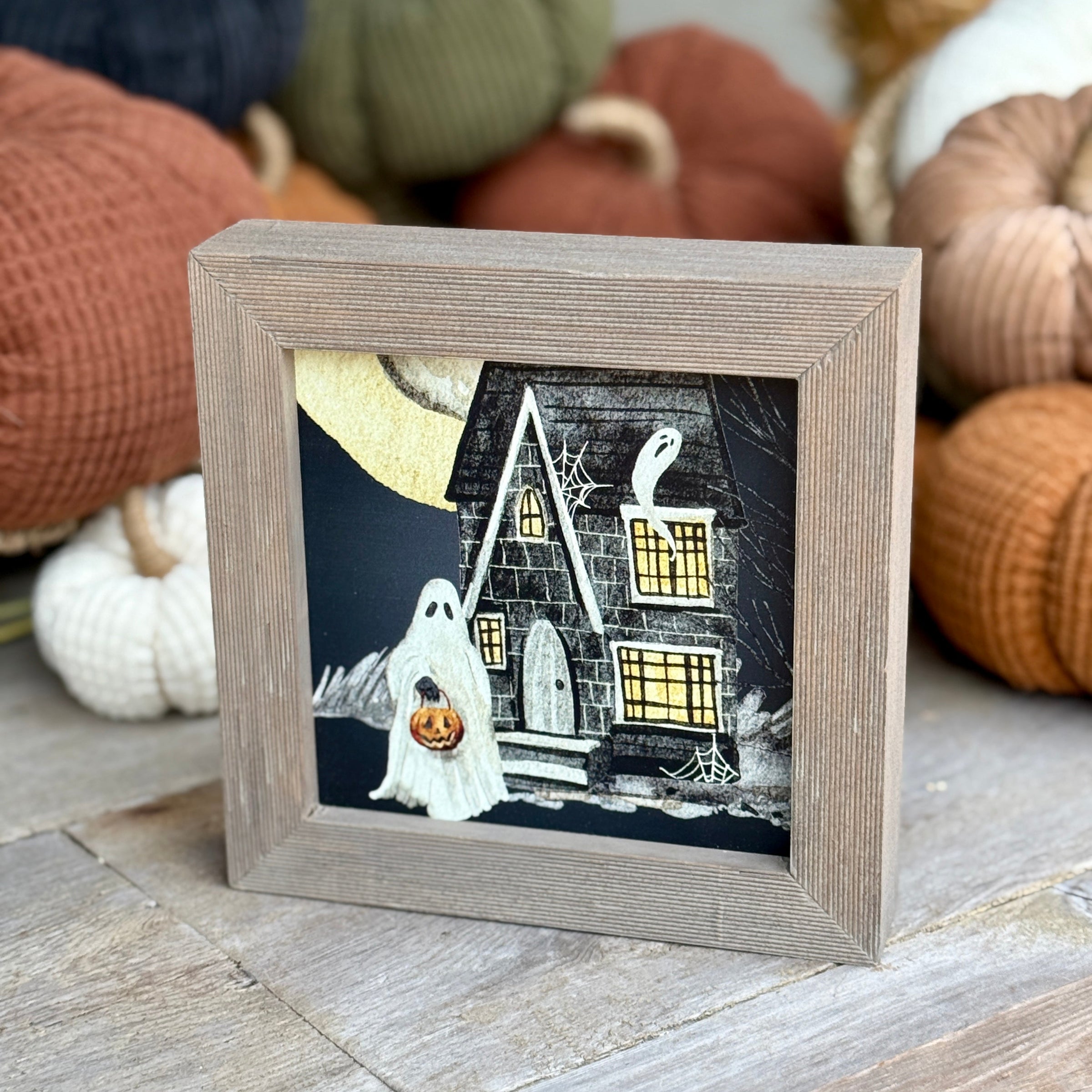Barnwood Frame with Ghost in front of Haunted House Artwork Painted onto Black Washed Wood Background