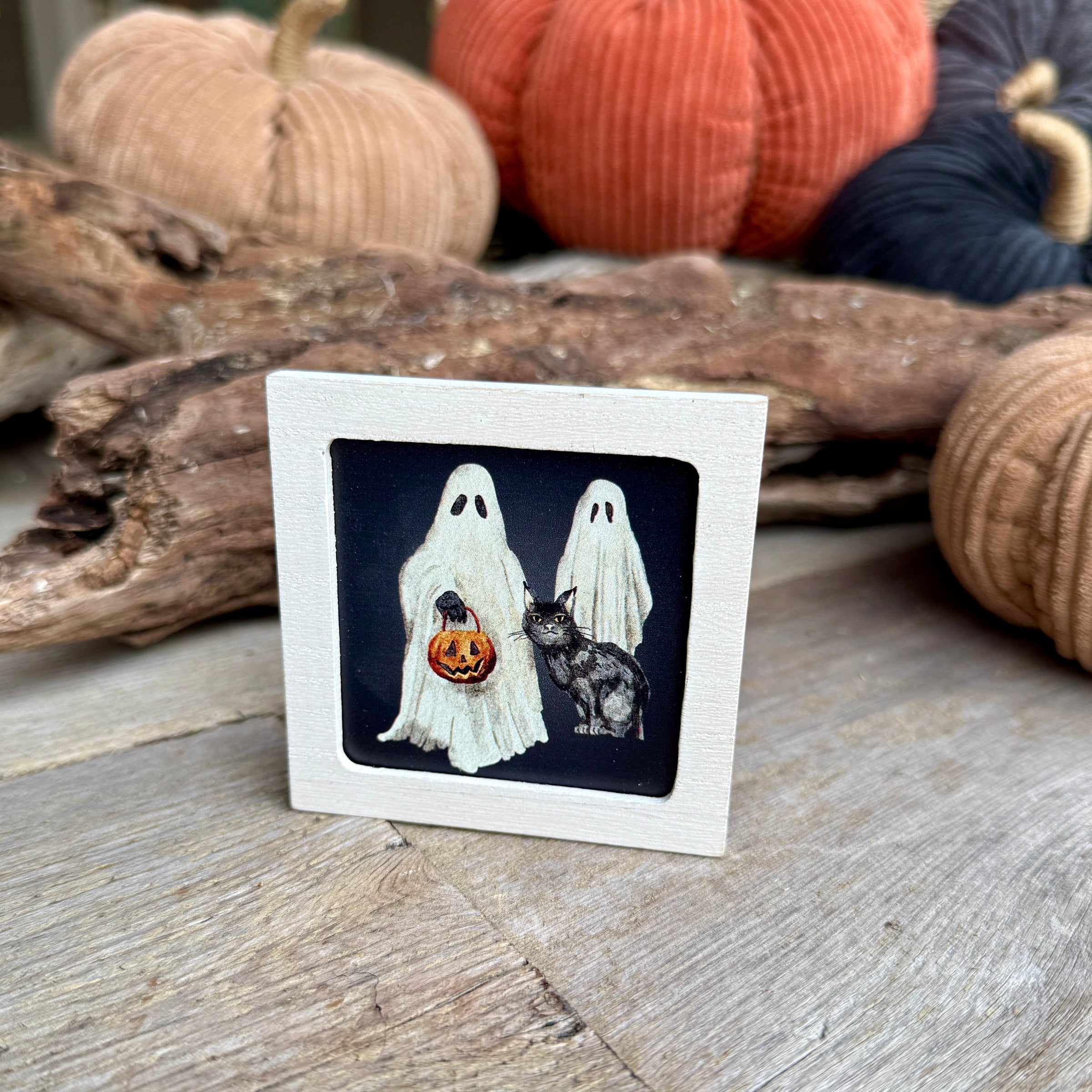 White Washed Wood Framed Magnet with Ghosts and Black Cat Artwork Painted onto Background