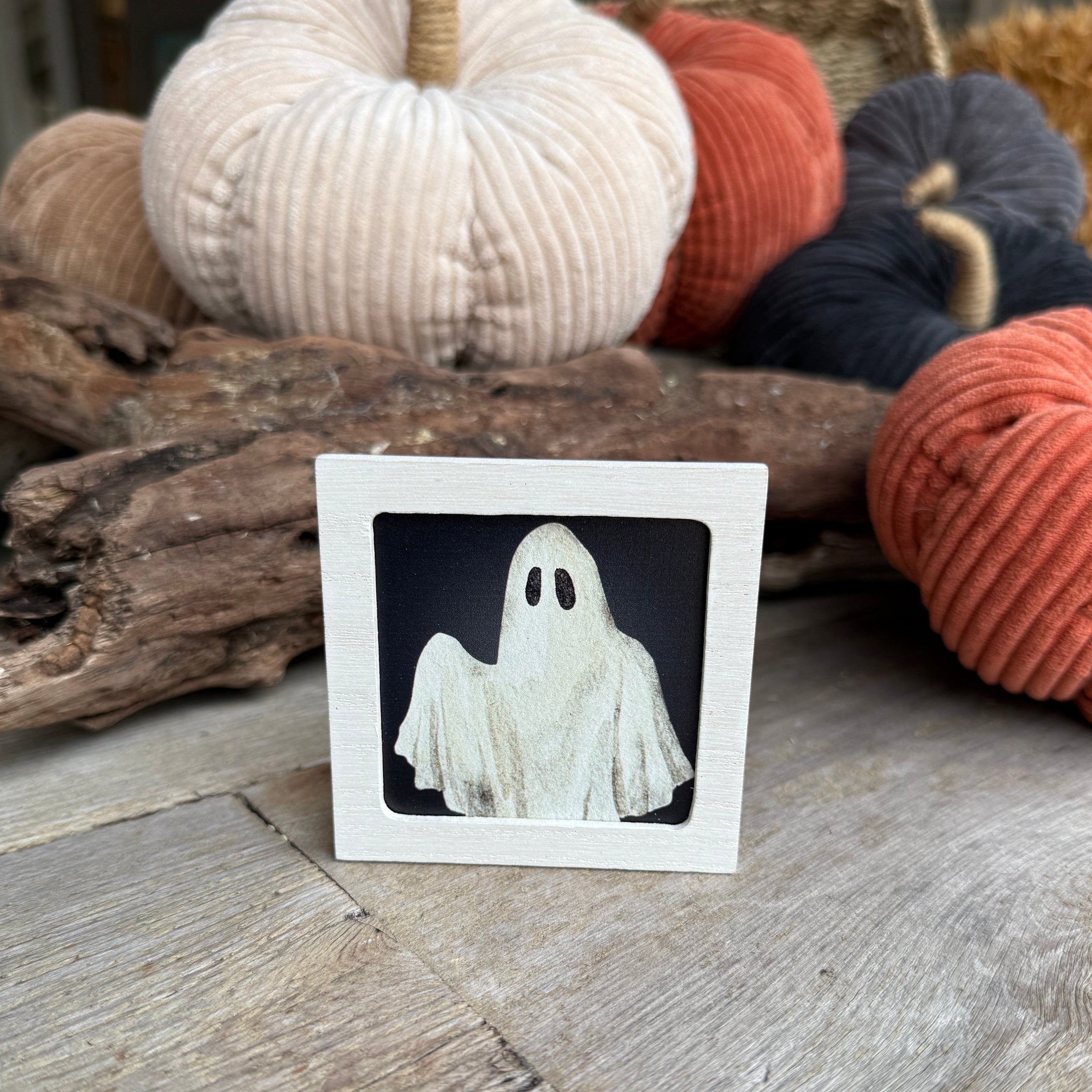 White Washed Wood Framed Magnet with Ghost Artwork Painted onto Background