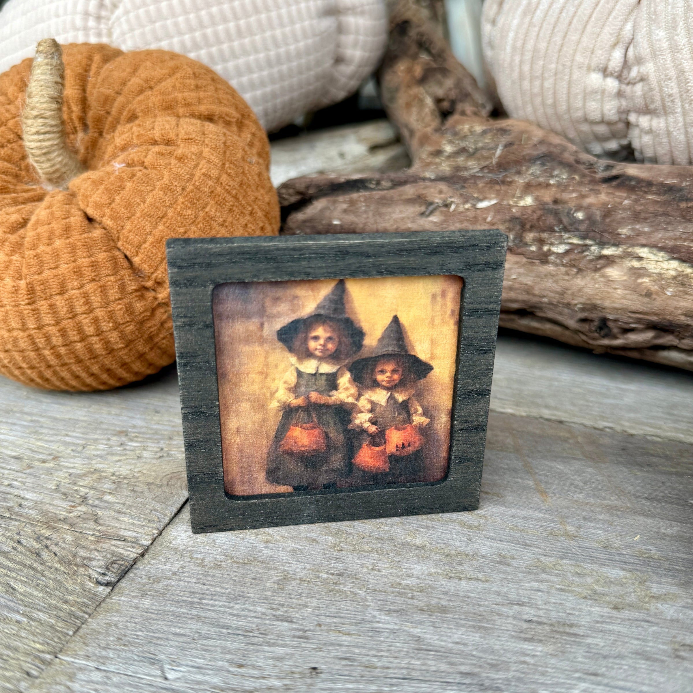 Black Washed Wood Framed Magnet with Two Witch Children Print Artwork Inside