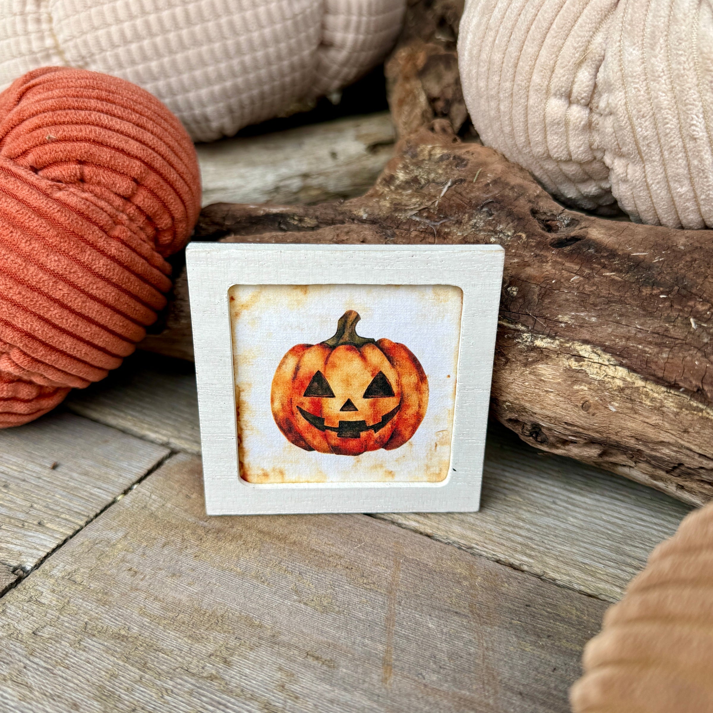 White Washed Wood Framed Magnet with Jack-o-Lantern Artwork Print Insidce