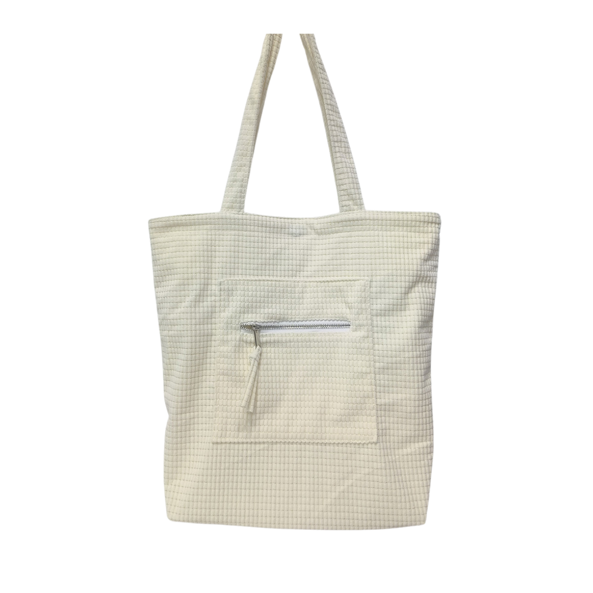 Biscuit Cross Cut Corduroy Tote with Outside Pocket with Corduroy Zipper Pull, Hanging Pocket Inside